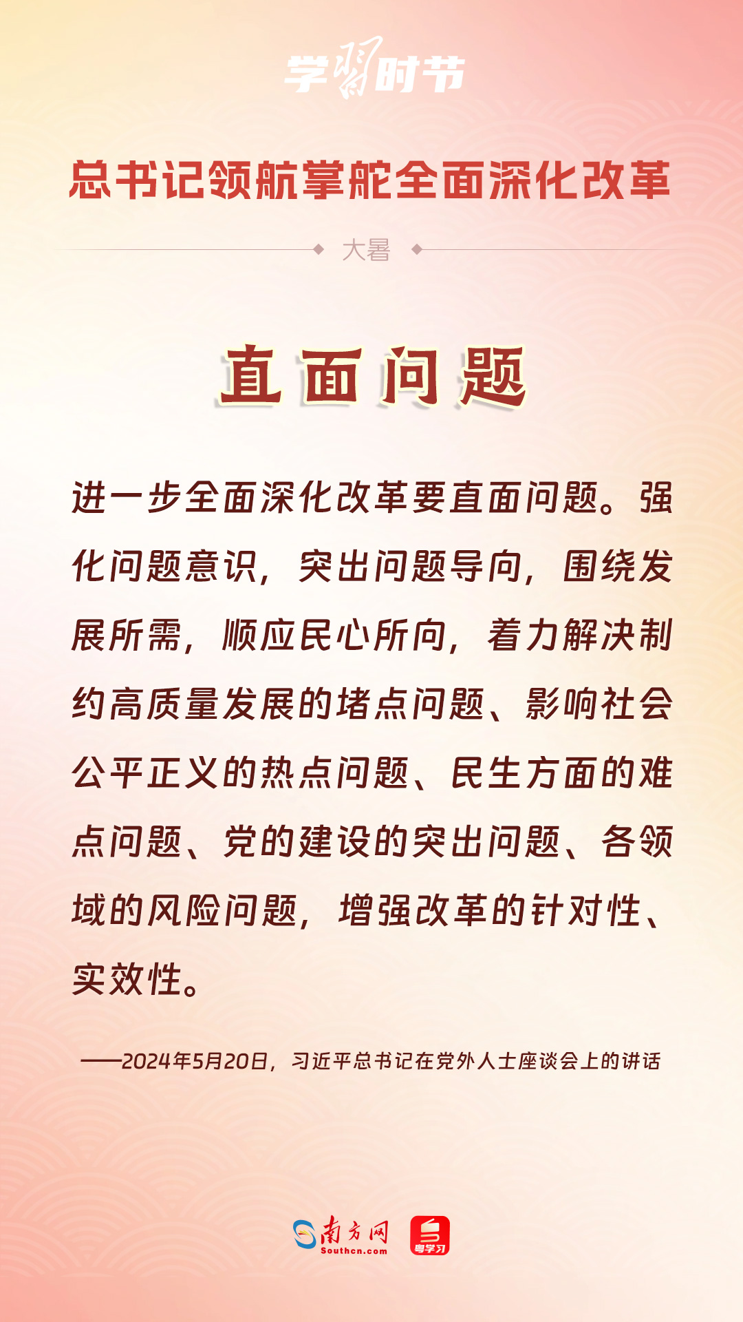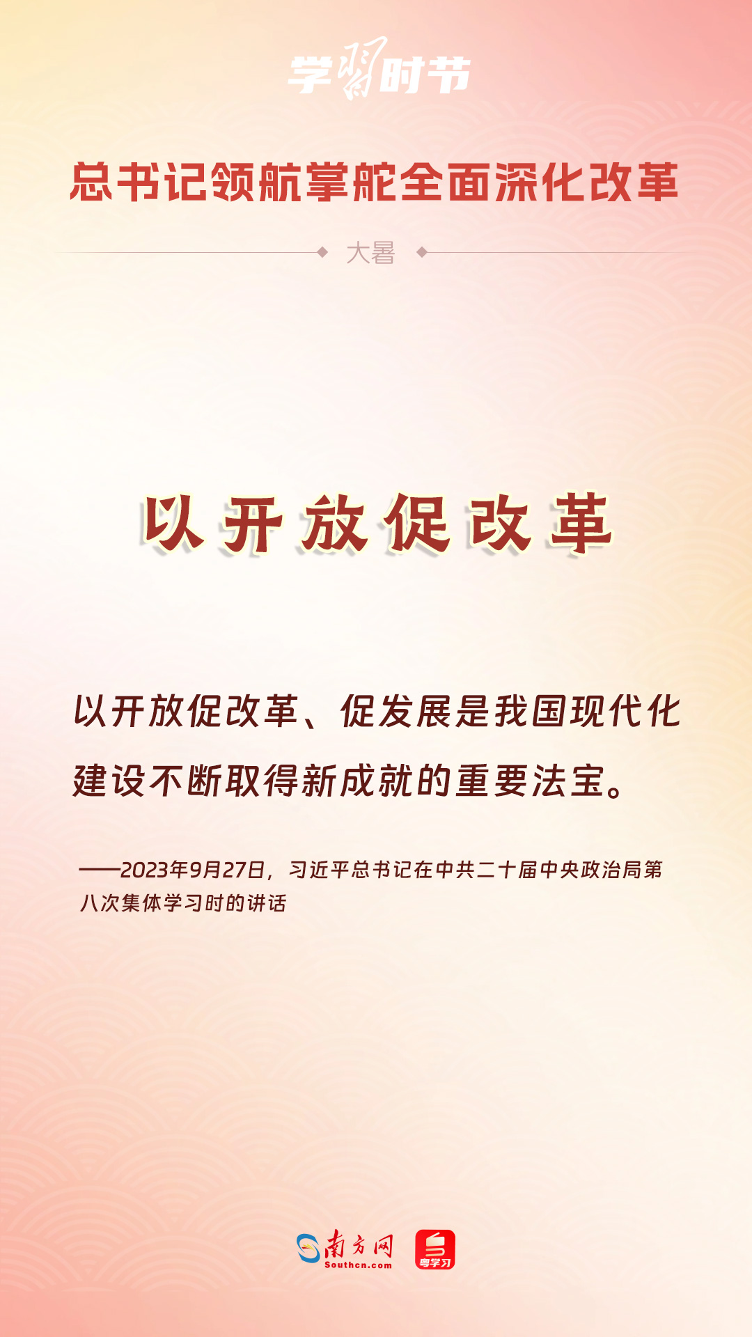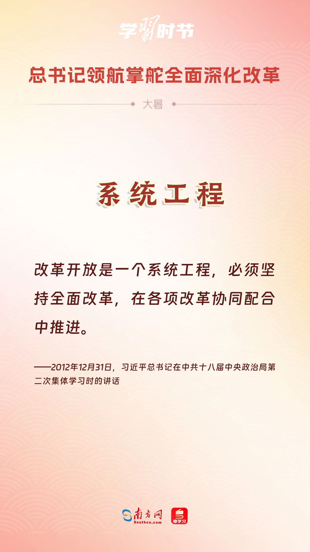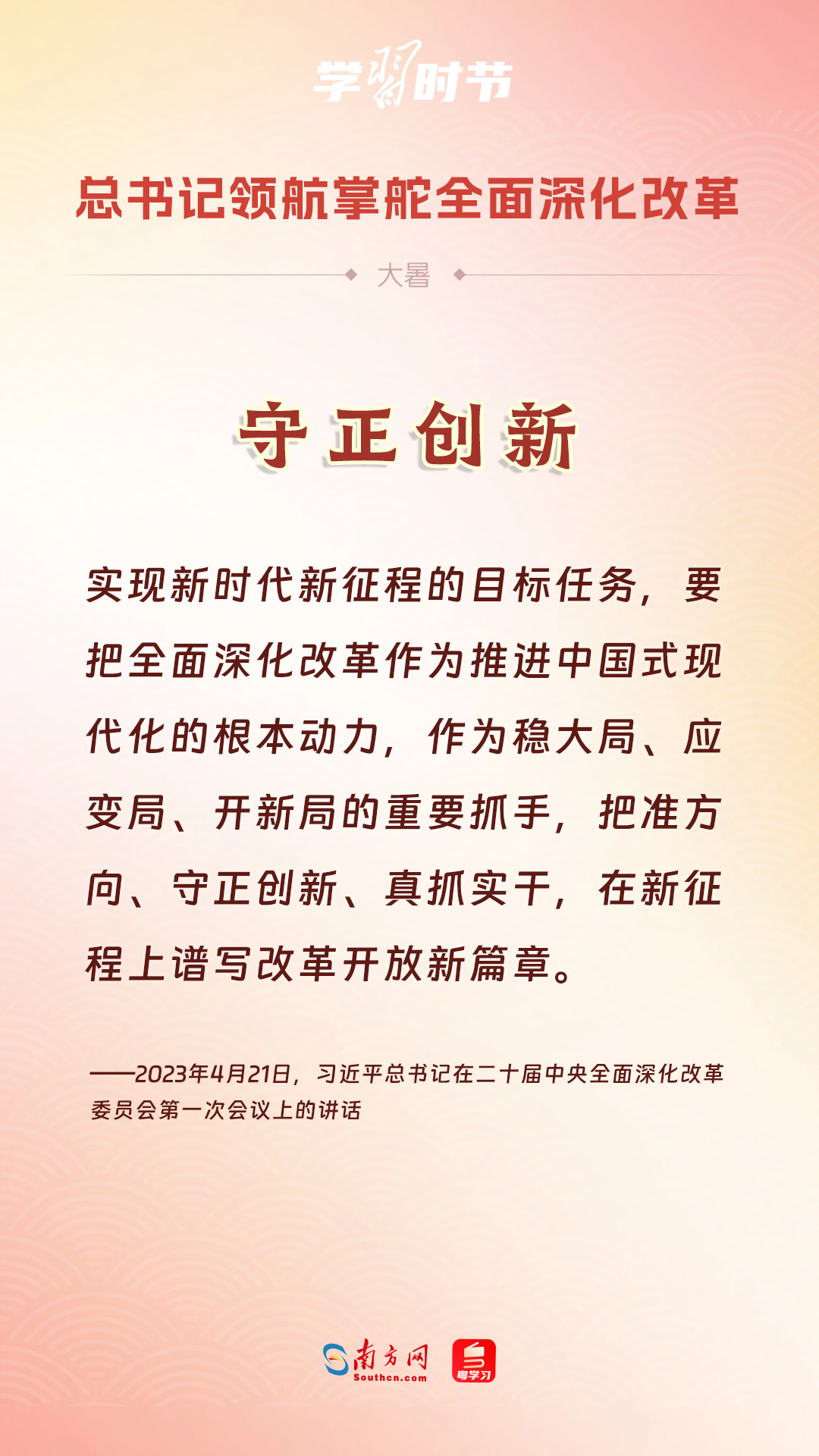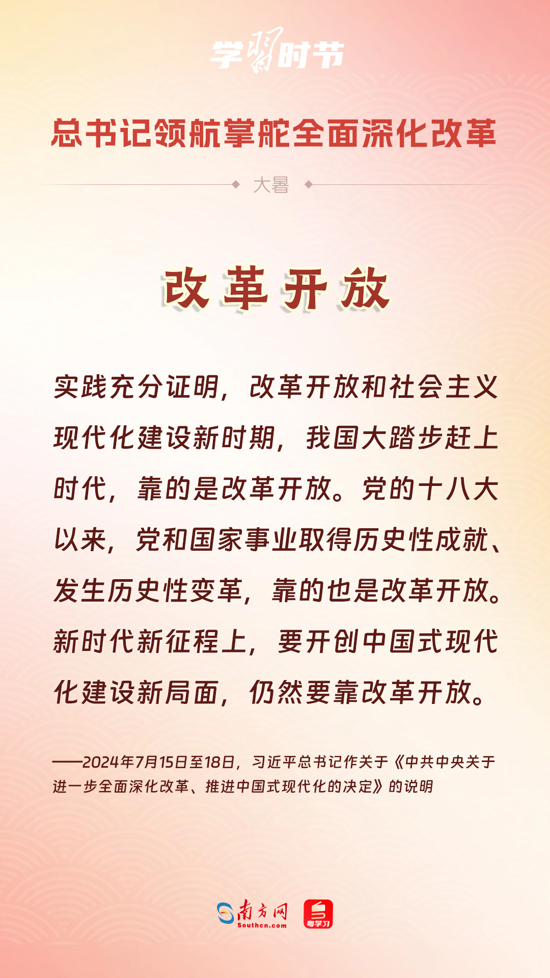 黨的十八大以來,習(xí)近平總書記親自領(lǐng)導(dǎo)、親自部署、親自推動全面深化改革工作,推動全面深化改革事業(yè)在攻堅克難中不斷邁上新臺階、取得新勝利。在驕陽似火的大暑時節(jié),通過一組海報,讓我們共同學(xué)習(xí)習(xí)近平總書記關(guān)于“全面深化改革”的重要論述。