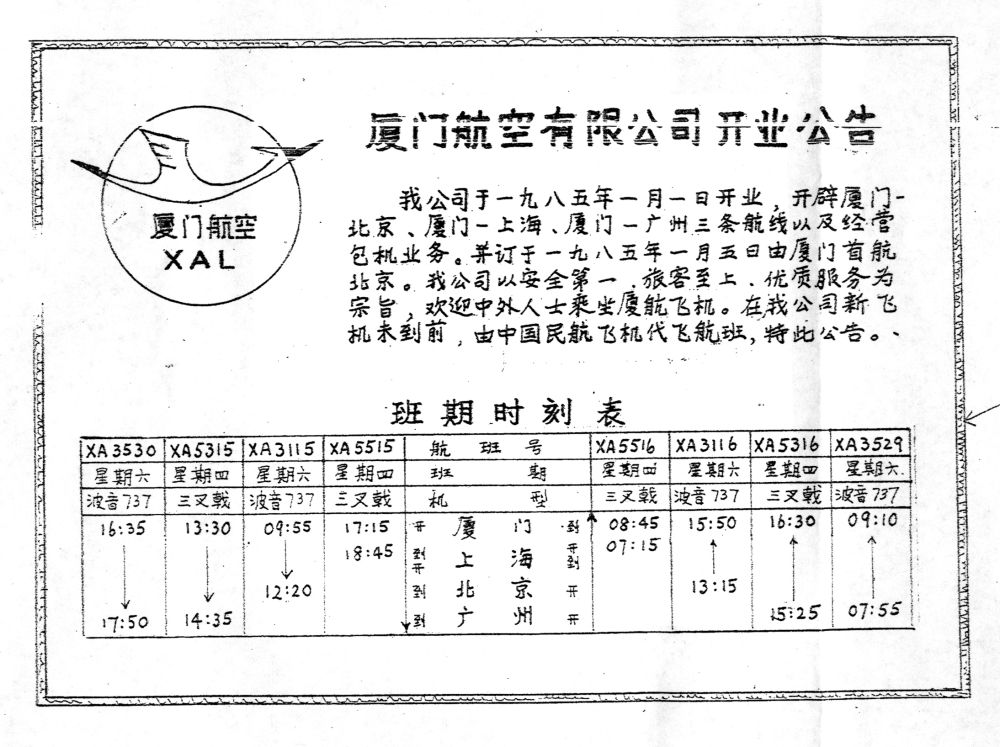 這是廈門(mén)航空開(kāi)業(yè)公告。