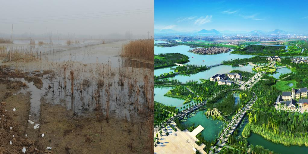 昔日的采煤塌陷區(qū)(左)被打造成濕地公園(右)(央廣網(wǎng)發(fā) 徐州市賈汪區(qū)攝影家協(xié)會供圖)