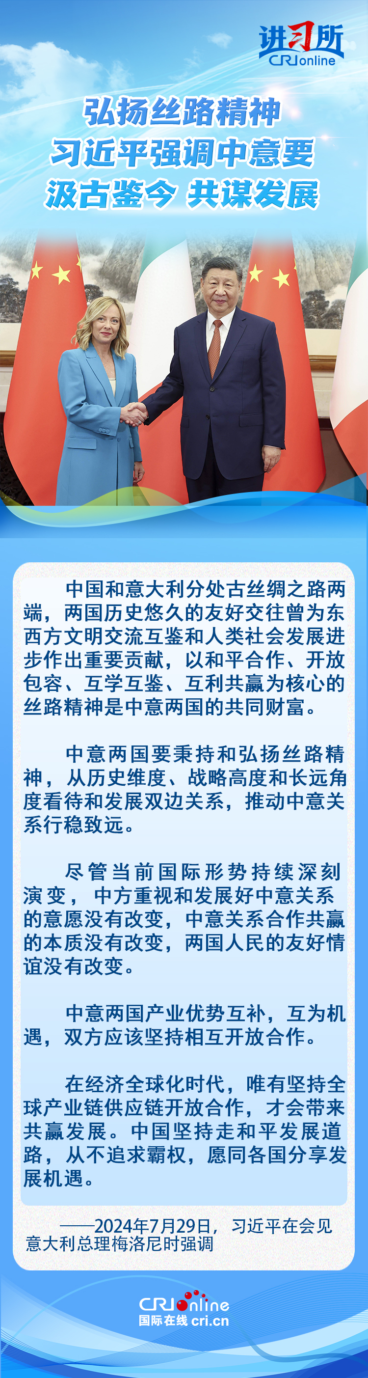 7月29日,中國國家主席習近平在北京會見來華進行正式訪問的意大利總理梅洛尼。習近平指出,今年是中意建立全面戰(zhàn)略伙伴關系20周年和馬可·波羅逝世700周年,雙方汲古鑒今、共謀發(fā)展面臨重要機遇。