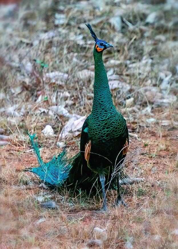 云南楚雄雙柏縣恐龍河自然保護(hù)區(qū)的綠孔雀(2023年4月20日攝)胡超 攝/本刊