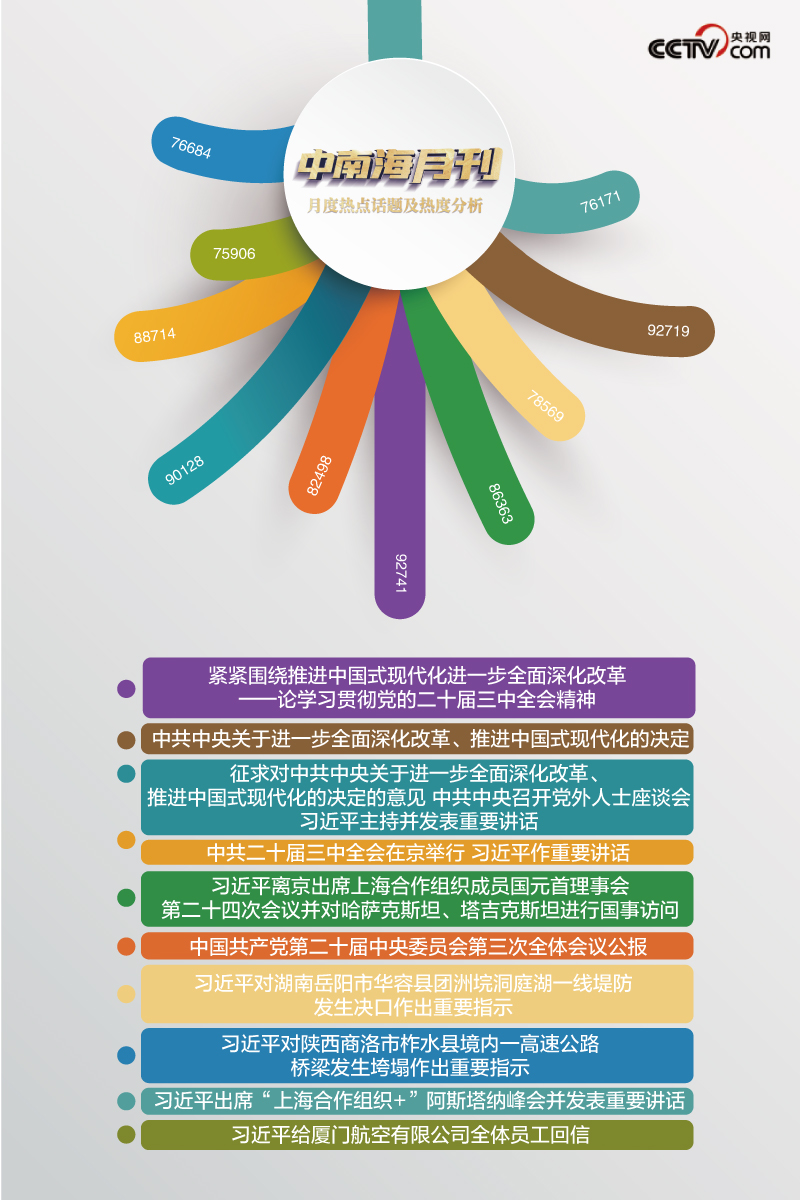 央視網(wǎng)“智聞”系統(tǒng)提取分析2024年7月全網(wǎng)時政新聞熱點顯示,本月“中共中央關于進一步全面深化改革、推進中國式現(xiàn)代化的決定”“中共二十屆三中全會在京舉行 習近平作重要講話”等話題備受關注。