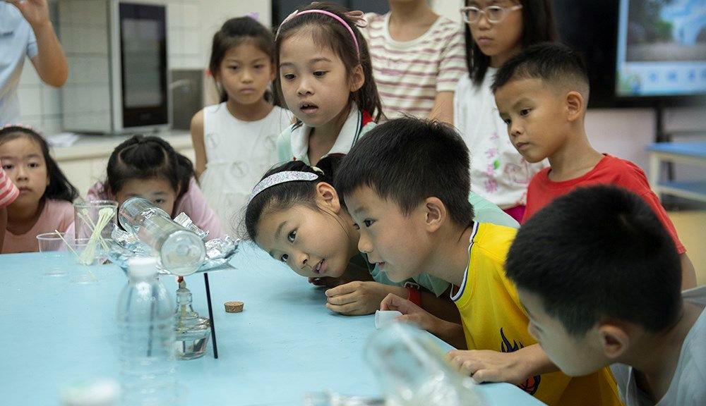 安徽科技館,小朋友觀察海水淡化科學(xué)實(shí)驗(yàn)。