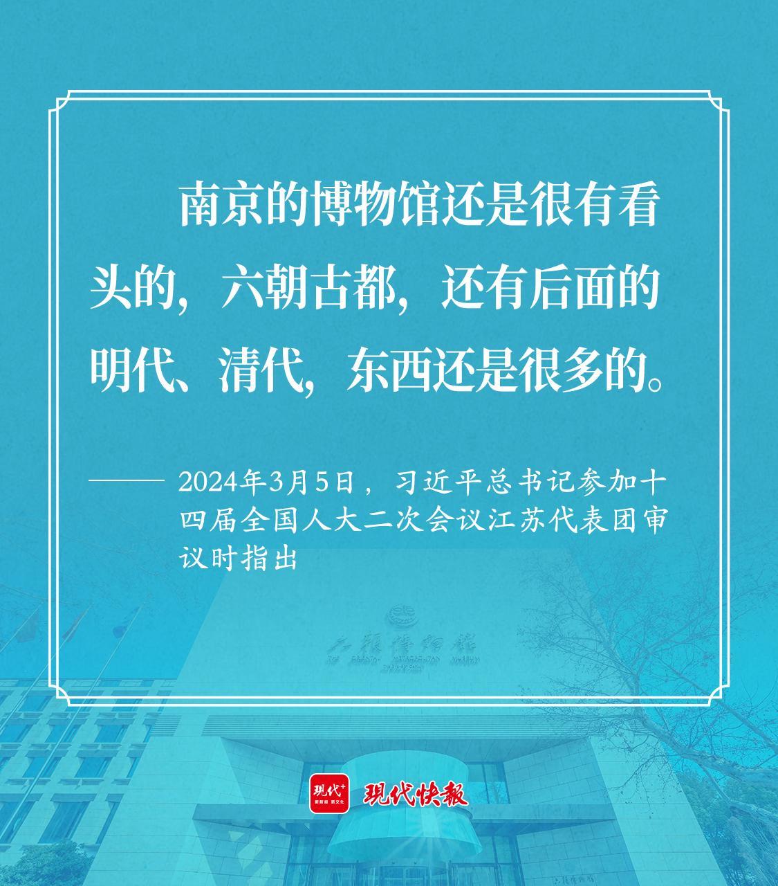 2024年3月5日,習(xí)近平總書記參加十四屆全國人大二次會議江蘇代表團審議??倳浽诼犕昴暇┦胁┪锟傪^副館長宋燕代表講述后表示,“南京的博物館還是很有看頭的,六朝古都,還有后面的明代、清代,東西還是很多的?!?/p>
