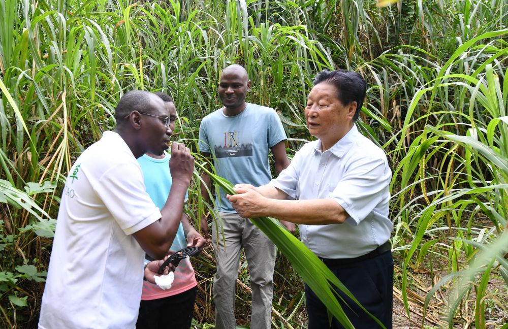 2021年8月12日,福建農(nóng)林大學(xué)國家菌草工程技術(shù)研究中心首席科學(xué)家林占熺(右一)在福建農(nóng)林大學(xué)菌草園讓尼日利亞留學(xué)生試嘗幼嫩菌草的味道。新華社記者 林善傳 攝