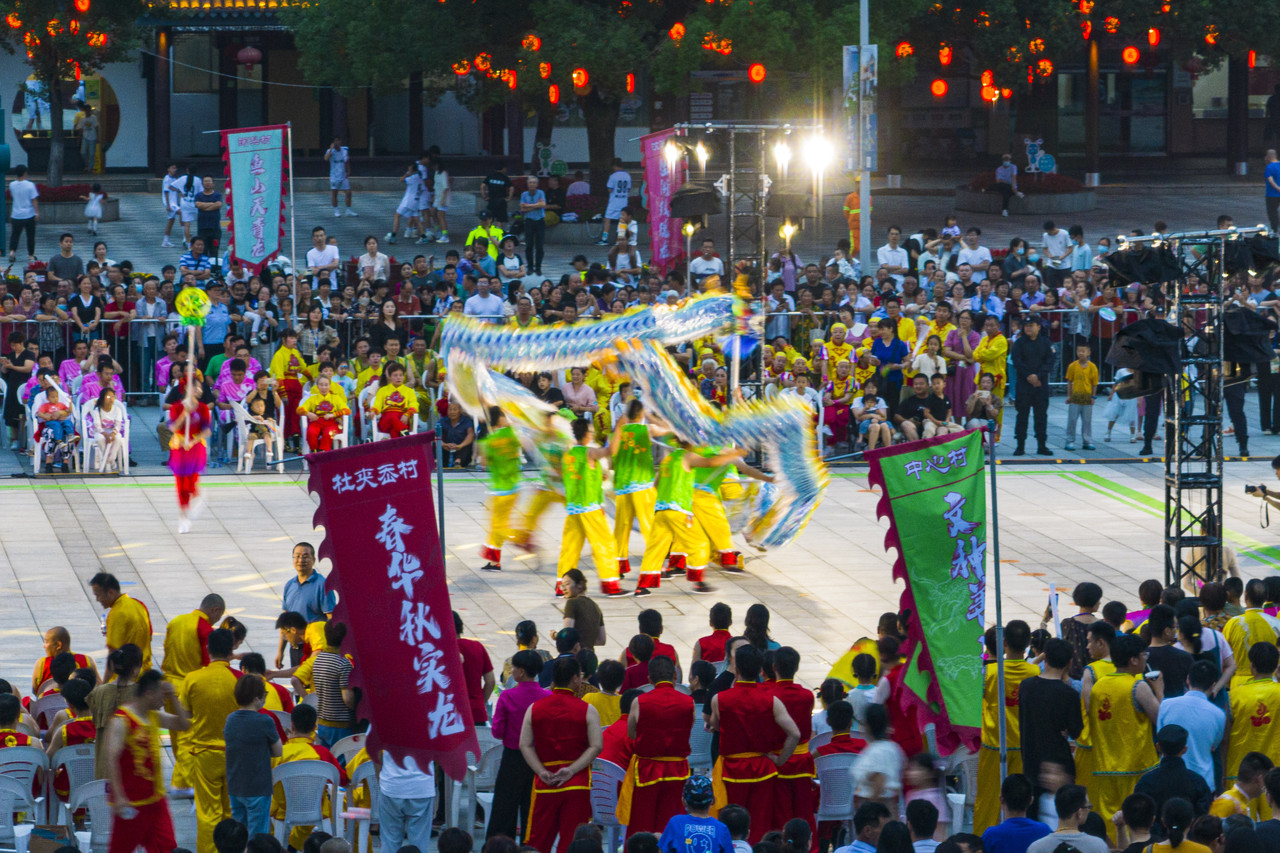 寧波市鎮(zhèn)海區(qū)九龍湖鎮(zhèn),當(dāng)?shù)鼐用褡园l(fā)組成的14支舞龍隊同臺競技 省農(nóng)業(yè)農(nóng)村廳供圖