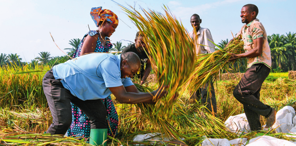 2018 年,中國農業(yè)專家組在布隆迪布班扎省吉漢加縣設立首個水稻減貧示范村。圖為當?shù)剞r戶在稻田里給雜交水稻脫粒(2023年6月20日攝) 韓旭攝 / 本刊