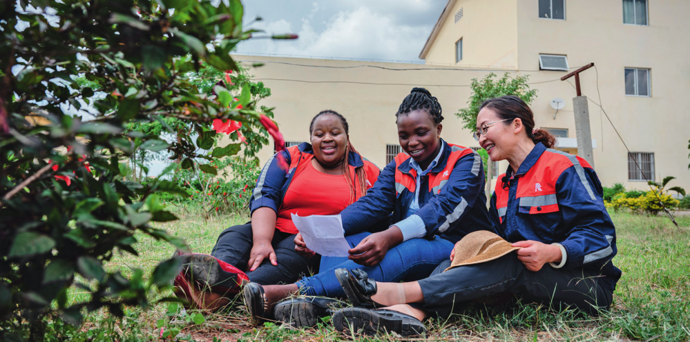 在肯尼亞內羅畢,非洲之星鐵路運營公司工電部電子設備檢修工區(qū)工長陳玲(右)在休息時教學員唱中文歌曲(2023年5月23日攝) 王冠森攝 / 本刊