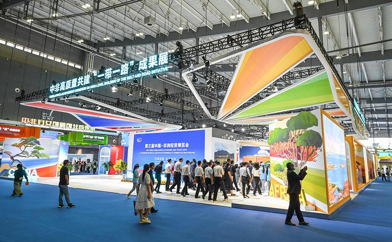 2023年6月29日,第三屆中國(guó)—非洲經(jīng)貿(mào)博覽會(huì)在湖南長(zhǎng)沙開(kāi)幕。圖為參會(huì)嘉賓在長(zhǎng)沙國(guó)際會(huì)展中心參觀中非高質(zhì)量共建“一帶一路”成果展。