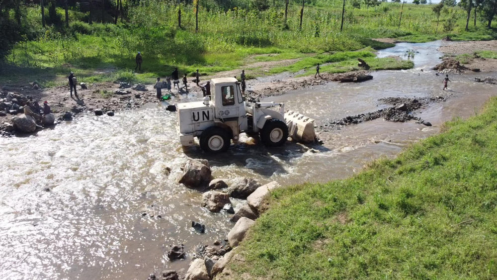 2023年6月7日,在剛果(金)南基伍省卡萊亥地區(qū),中國第26批赴剛果(金)維和工兵分隊(duì)官兵進(jìn)行施工作業(yè)。