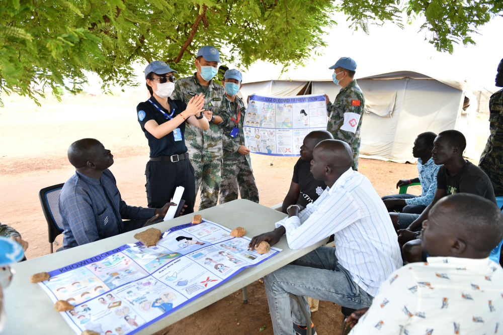 2020年3月,在南蘇丹首都朱巴,執(zhí)行聯(lián)合國維和任務(wù)的中國維和警察廖潔給當(dāng)?shù)鼐熘v解防疫知識(shí)。