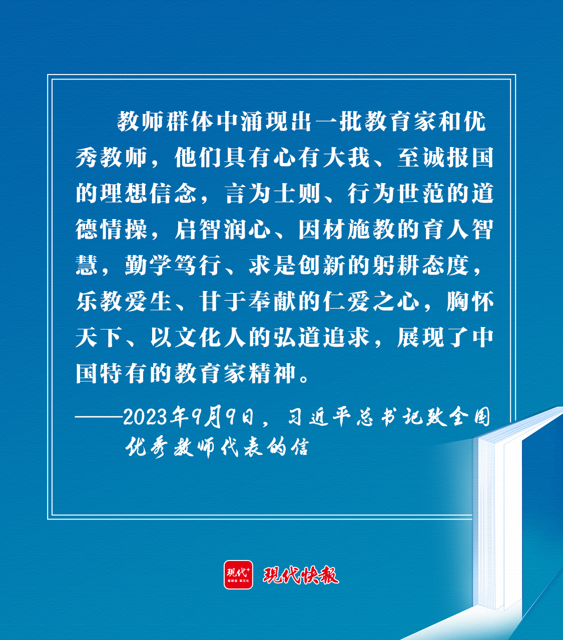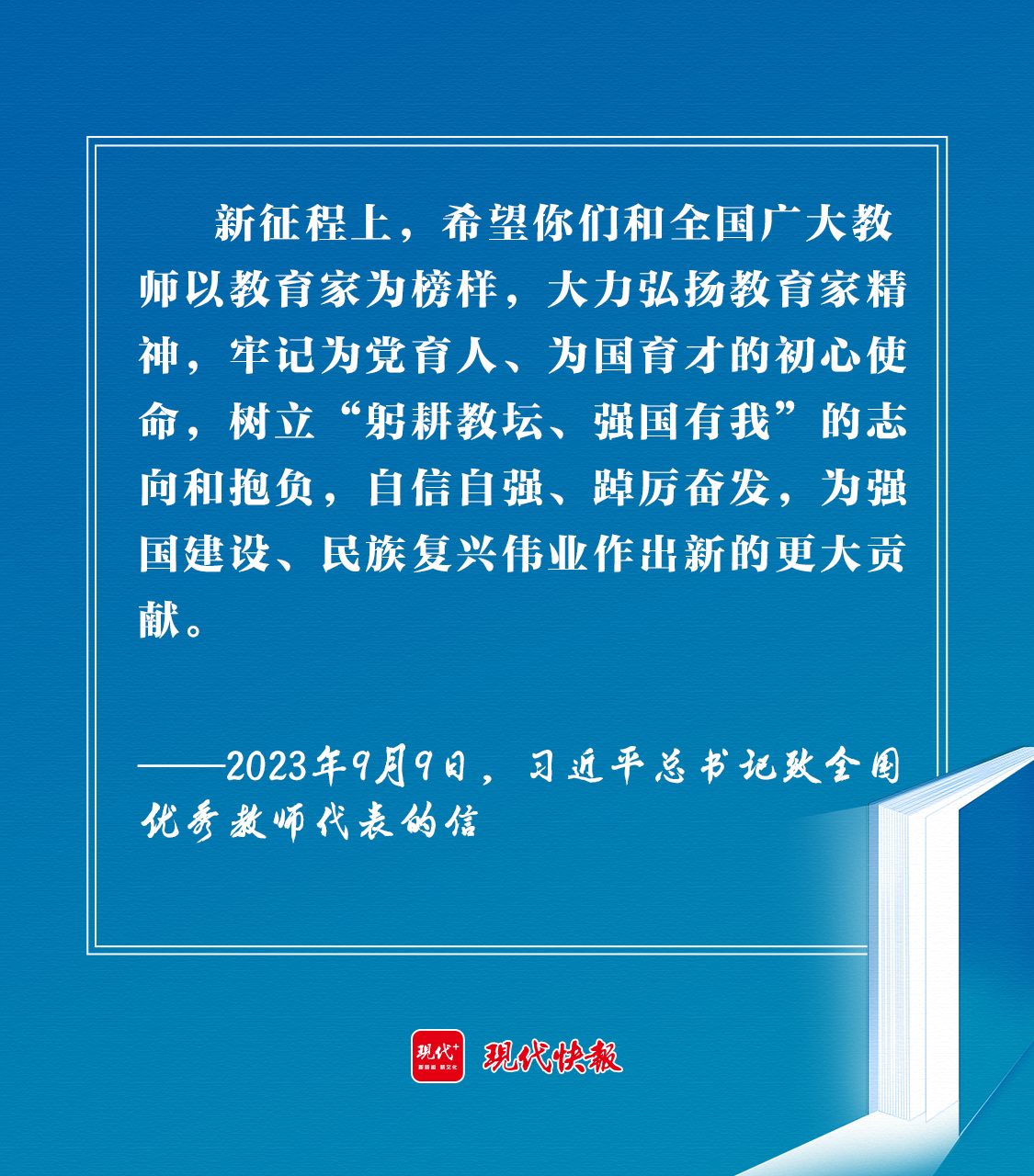 2023年9月9日,習(xí)近平總書記在致全國(guó)優(yōu)秀教師代表的信中強(qiáng)調(diào):“新征程上,希望你們和全國(guó)廣大教師以教育家為榜樣,大力弘揚(yáng)教育家精神,牢記為黨育人、為國(guó)育才的初心使命,樹立‘躬耕教壇、強(qiáng)國(guó)有我’的志向和抱負(fù),自信自強(qiáng)、踔厲奮發(fā),為強(qiáng)國(guó)建設(shè)、民族復(fù)興偉業(yè)作出新的更大貢獻(xiàn)?!?/p>