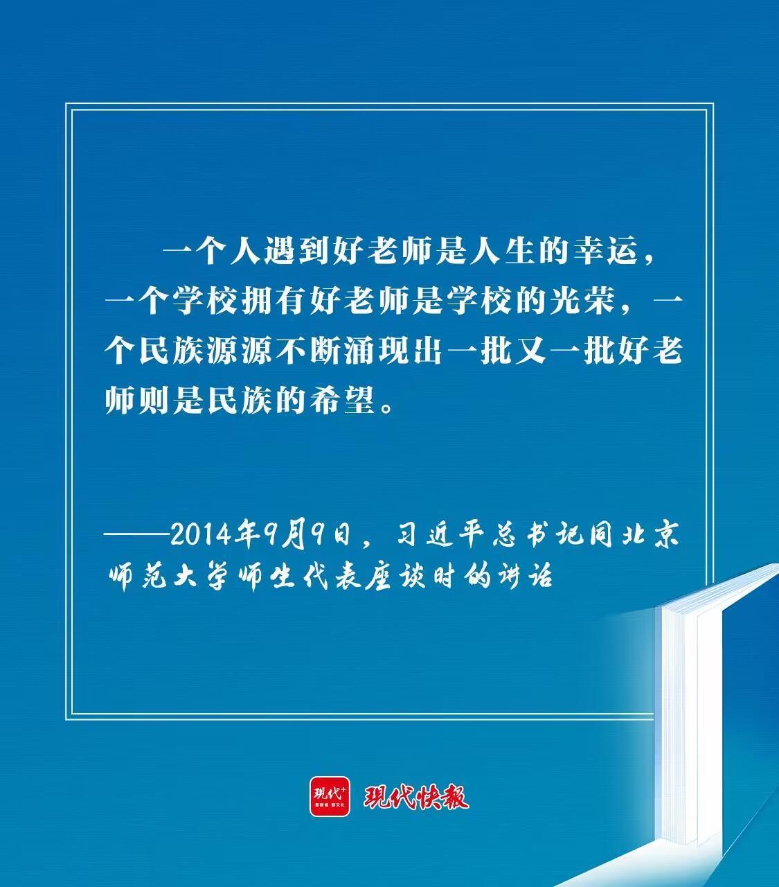 “一個(gè)人遇到好老師是人生的幸運(yùn),一個(gè)學(xué)校擁有好老師是學(xué)校的光榮,一個(gè)民族源源不斷涌現(xiàn)出一批又一批好老師則是民族的希望?!?014年教師節(jié)前夕,同北京師范大學(xué)師生代表座談時(shí),習(xí)近平總書記的殷殷期盼,激勵(lì)廣大教師為民族復(fù)興拼搏奮斗。