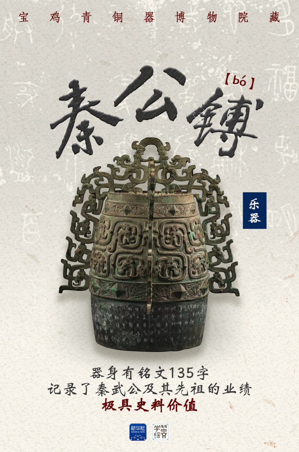 這件秦公镈是大型打擊樂(lè)器,器身有135字銘文,記述了秦襄公被周平王“賞宅受國(guó)”的歷史,以及文公、靜公、憲公三代治國(guó)興邦的業(yè)績(jī),是研究秦國(guó)早期歷史的重要實(shí)物資料。