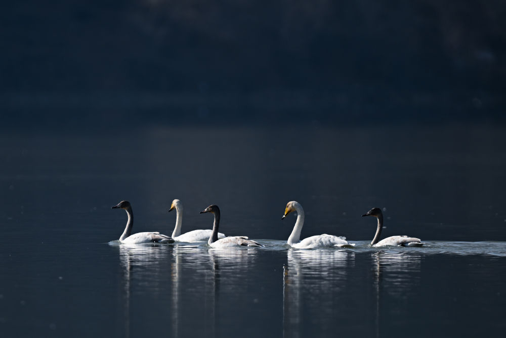 2023年11月30日,天鵝在青海省海東市化隆回族自治縣群科鎮(zhèn)境內(nèi)的黃河上游弋。近年來(lái),青海省加大力度保護(hù)治理境內(nèi)黃河流域,改善當(dāng)?shù)厣鷳B(tài)環(huán)境,為越冬候鳥(niǎo)提供良好棲息地。