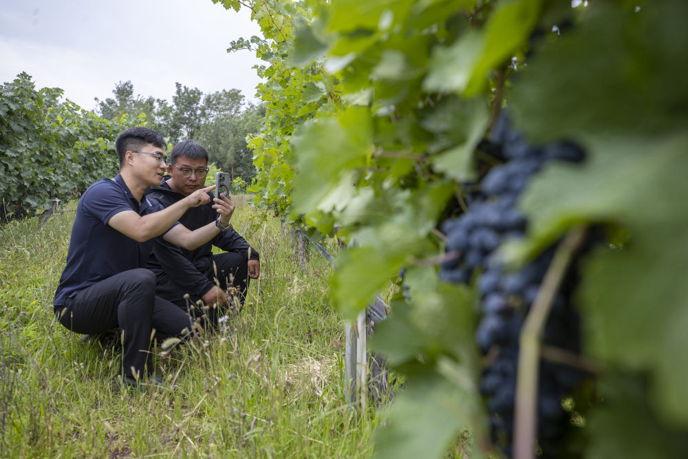 2024年8月15日,技術(shù)人員(左)和工作人員在寧夏銀川市西夏區(qū)的一個(gè)葡萄園工作。為推動(dòng)黃河流域生態(tài)保護(hù)和高質(zhì)量發(fā)展先行區(qū)建設(shè),銀川市積極打造高標(biāo)準(zhǔn)葡萄園,借助各種傳感器監(jiān)測(cè)釀酒葡萄的生長(zhǎng)狀態(tài),實(shí)現(xiàn)精準(zhǔn)灌溉,從而高效節(jié)約黃河水。
