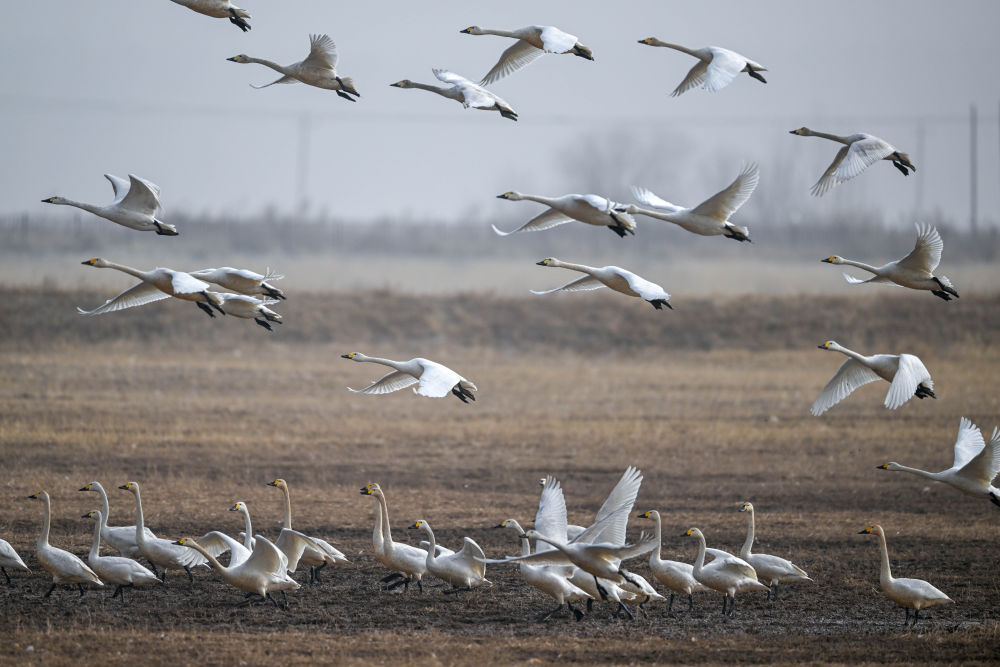 2024年3月16日在內(nèi)蒙古呼和浩特市托克托縣黃河濕地拍攝的天鵝。隨著當(dāng)?shù)厣鷳B(tài)環(huán)境持續(xù)改善,候鳥(niǎo)數(shù)量連年增加。