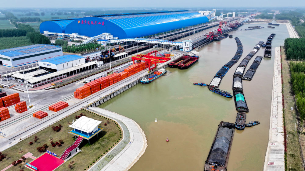 2024年4月24日,船舶行駛在山東濟(jì)寧港航梁山港航道上(無(wú)人機(jī)照片)。近年來(lái),山東省加快構(gòu)建沿黃陸海大通道,有效促進(jìn)黃河流域各省區(qū)物流降本增效,實(shí)現(xiàn)更高水平對(duì)外開(kāi)放。
