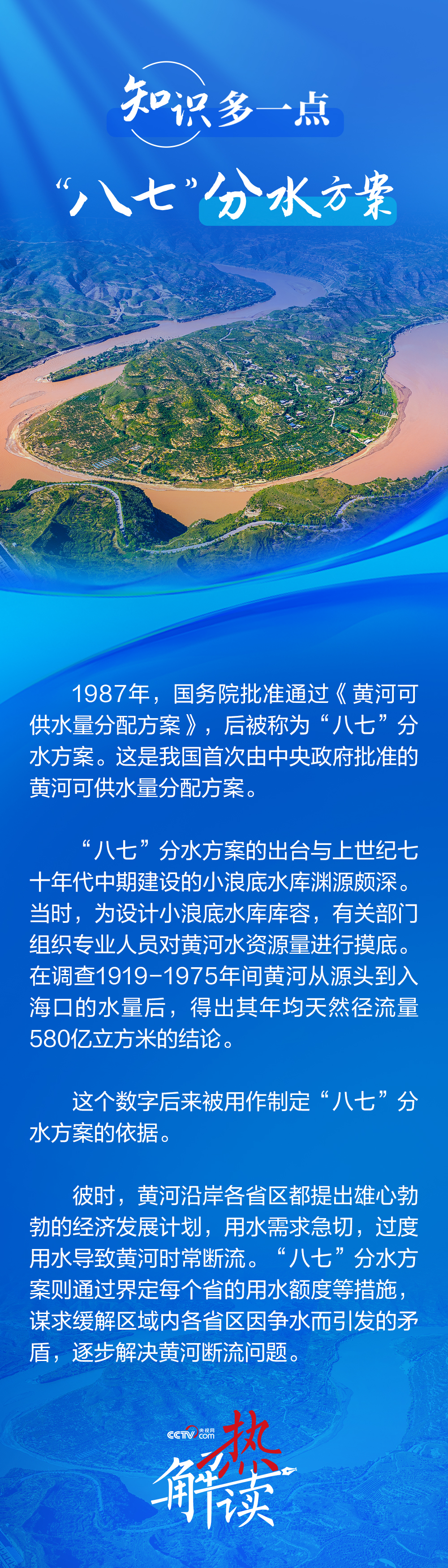 “八七”分水方案是上世紀八十年代我國批準的黃河可供水量分配方案。該方案以1980年實際用水量為基準,綜合考慮了沿黃各省區(qū)的灌溉發(fā)展規(guī)模、工業(yè)和城市用水增長以及大中型水利工程興建等因素,來為沿黃各省區(qū)分配黃河用水權(quán)?!鞍似摺狈炙桨缸?987年國務院批復后沿用至今,未重新調(diào)整。