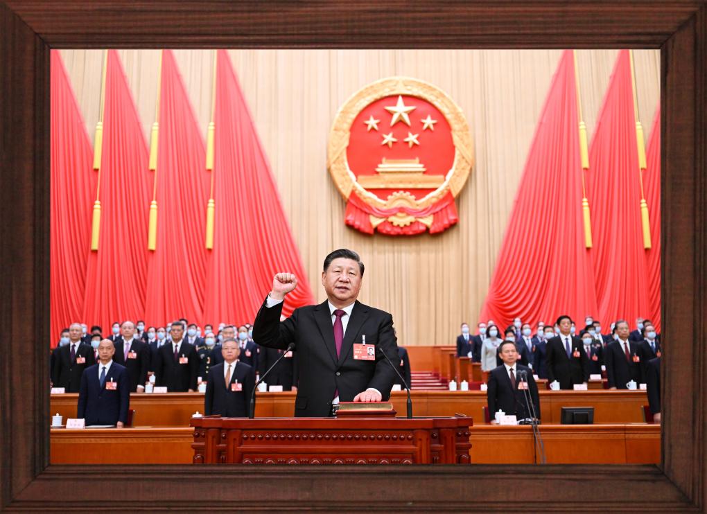 2023年3月10日,北京人民大會(huì)堂。全票當(dāng)選國(guó)家主席、中央軍委主席的習(xí)近平,左手撫按《中華人民共和國(guó)憲法》,右手舉拳,面向近3000名全國(guó)人大代表,鄭重宣誓。
