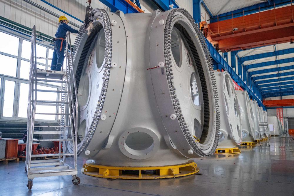 2024年4月28日,工作人員在中國一重集團有限公司的風電設(shè)備裝配車間內(nèi)加工風電輪轂。