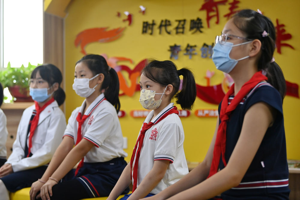 天津市和平區(qū)新星小學(xué)學(xué)生在觀看電影《我和我的祖國》(2021年9月28日攝)。
