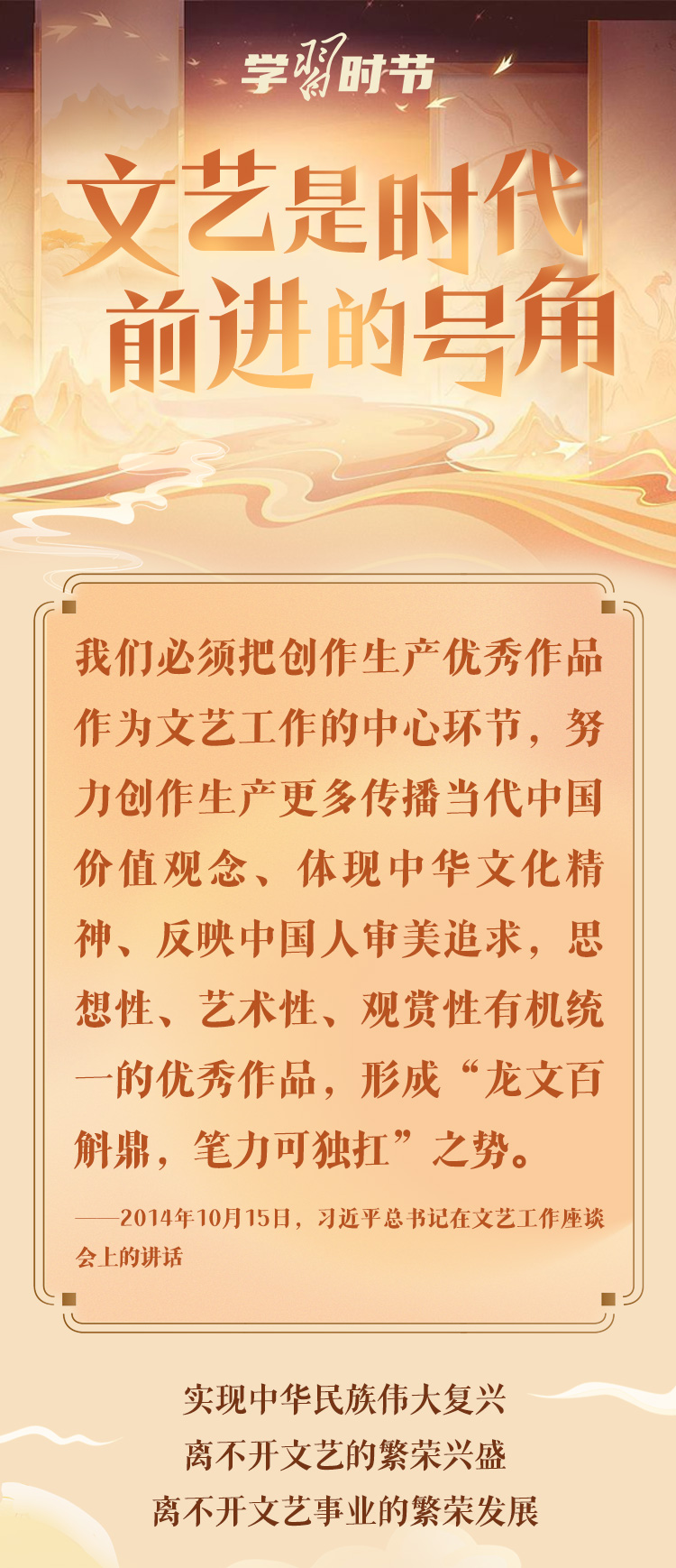 文藝是時代前進的號角,最能代表一個時代的風貌,最能引領一個時代的風氣。十年來,在習近平總書記的指引下,我國文藝面貌發(fā)生深刻變化,一系列代表性作品、標志性現(xiàn)象和時代性特征,勾畫了新時代文藝的獨特景觀,彰顯了新時代文藝的豐富內涵。
