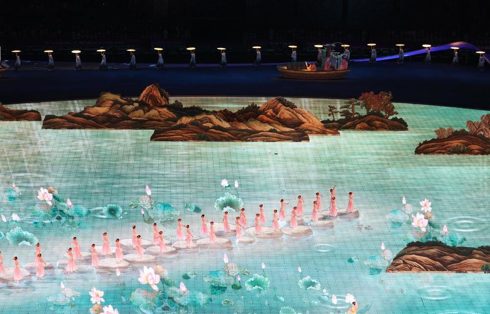 2023年9月23日,演員在杭州亞運(yùn)會開幕式上表演?!肚Ю锝綀D》和《富春山居圖》兩幅國寶級名畫,通過數(shù)字技術(shù),成為移動的山水。