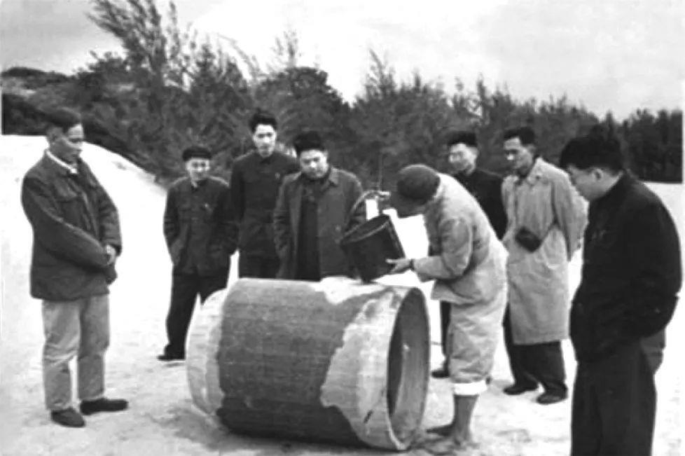 谷文昌在湖尾地下水工地與工程技術(shù)人員一起試驗濾水管。