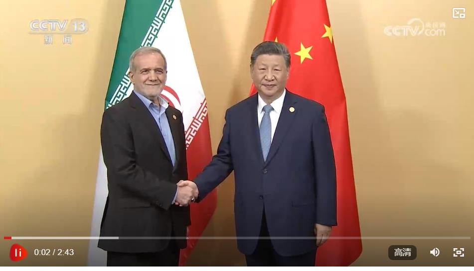 習(xí)近平祝賀并歡迎伊朗首次作為正式成員參加金磚國家領(lǐng)導(dǎo)人會(huì)晤,指出中方愿同伊方在金磚等多邊框架內(nèi)加強(qiáng)合作,進(jìn)一步提升全球南方的影響力和發(fā)言權(quán),推動(dòng)國際秩序朝著更加公正合理的方向發(fā)展。