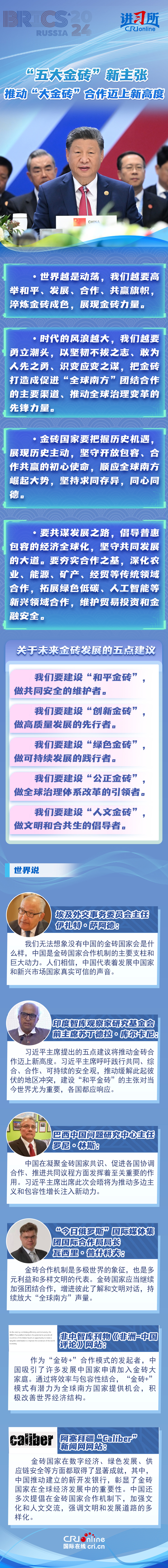 “時代的風浪越大,我們越要勇立潮頭,以堅韌不拔之志、敢為人先之勇、識變應(yīng)變之謀,把金磚打造成促進‘全球南方’團結(jié)合作的主要渠道、推動全球治理變革的先鋒力量?!碑?shù)貢r間10月23日,習近平主席在俄羅斯喀山出席金磚國家領(lǐng)導人第十六次會晤并發(fā)表重要講話,提出共建“和平金磚”“創(chuàng)新金磚”“綠色金磚”“公正金磚”“人文金磚”,為“大金磚合作”擘畫藍圖。