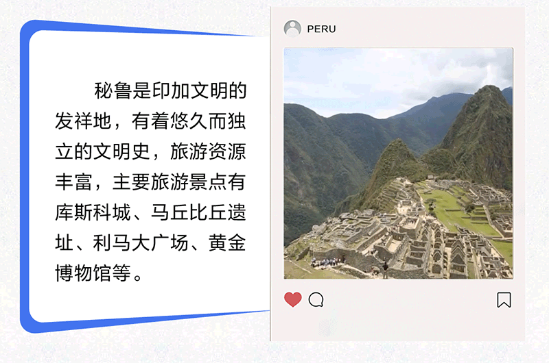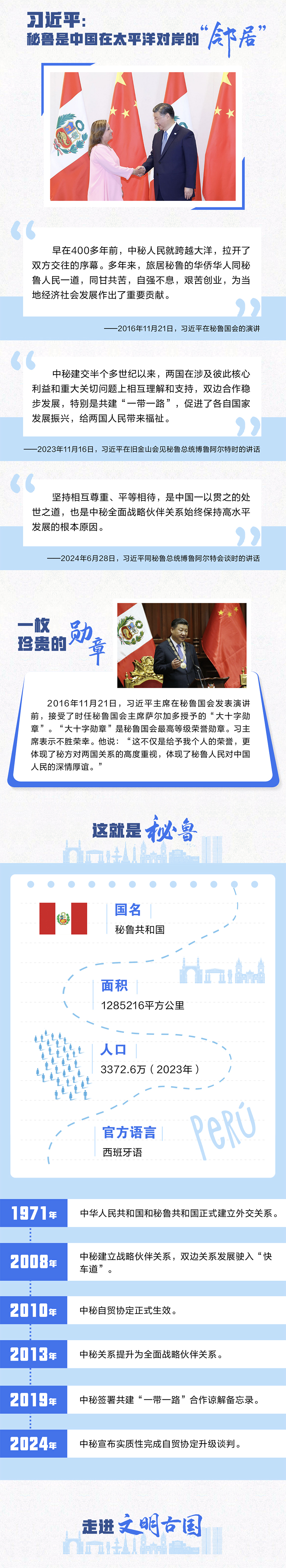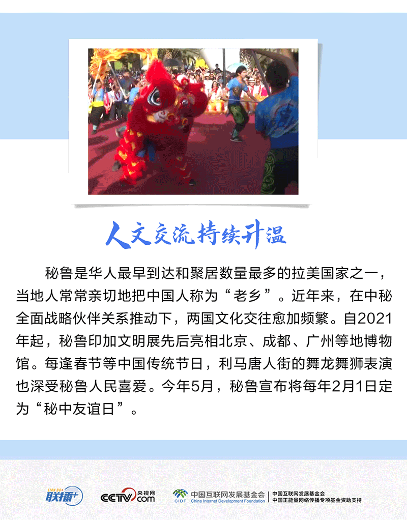 中國(guó)和秘魯都是文明古國(guó),兩國(guó)友誼源遠(yuǎn)流長(zhǎng),人民友好深入人心。習(xí)近平主席曾以“秘魯是中國(guó)在太平洋對(duì)岸的‘鄰居’”形容中秘關(guān)系,生動(dòng)詮釋了兩國(guó)和兩國(guó)人民之間“相知無(wú)遠(yuǎn)近”的深厚友誼。
