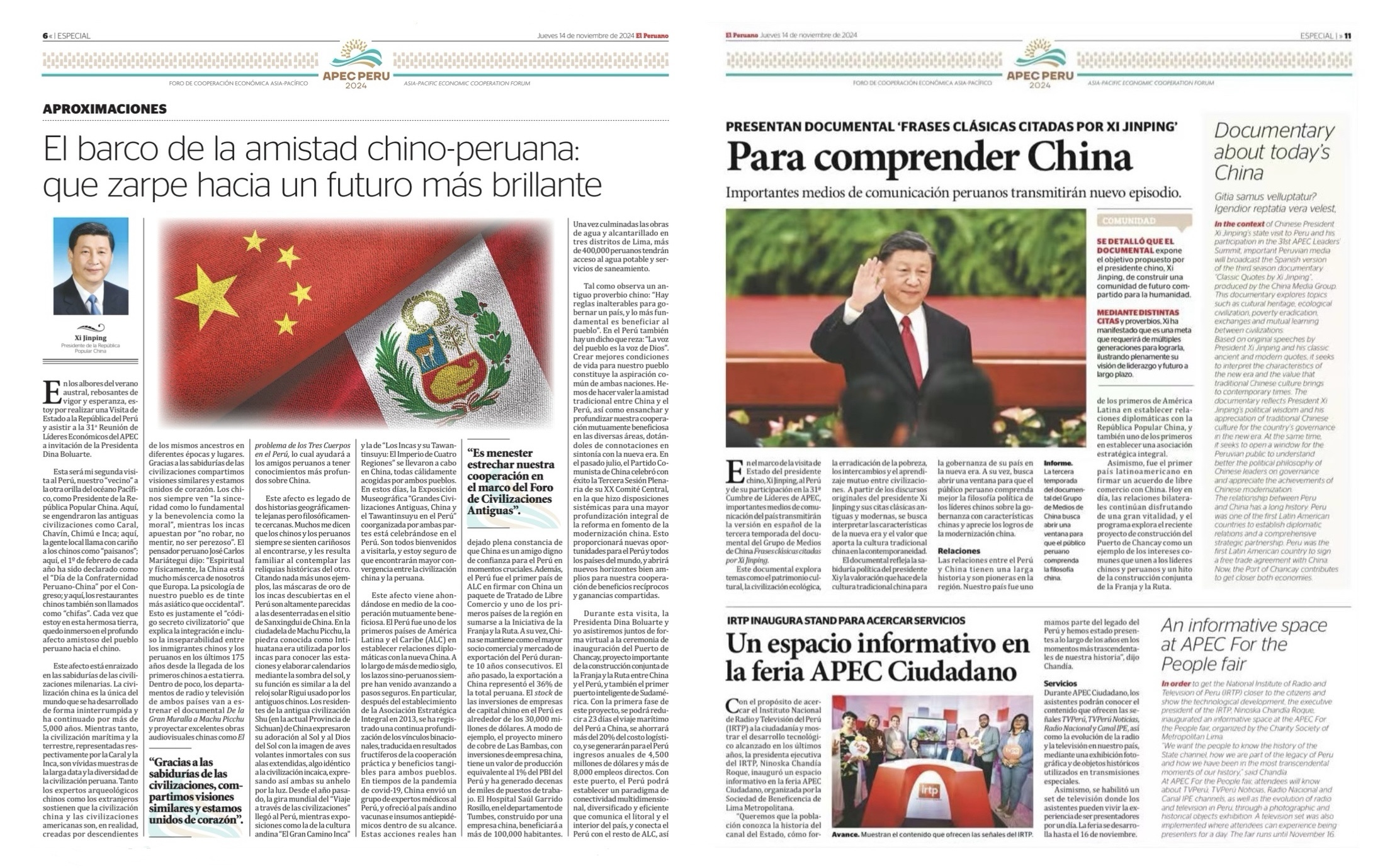 在中國國家主席習(xí)近平應(yīng)秘魯共和國總統(tǒng)博魯阿爾特邀請,赴利馬出席亞太經(jīng)合組織第三十一次領(lǐng)導(dǎo)人非正式會議并對秘魯進(jìn)行國事訪問之際,由中國中央廣播電視總臺制作的《平“語”近人——習(xí)近平喜歡的典故》第三季(西班牙語版),將于當(dāng)?shù)貢r間11月14日起在秘魯國家廣播電視臺、秘魯電視聯(lián)播網(wǎng)、秘魯廣播節(jié)目集團(tuán)電視端等多平臺落地播出。當(dāng)?shù)囟嗉抑髁髅襟w對節(jié)目落播進(jìn)行預(yù)告,引發(fā)秘魯各界普遍期待和廣泛關(guān)注。