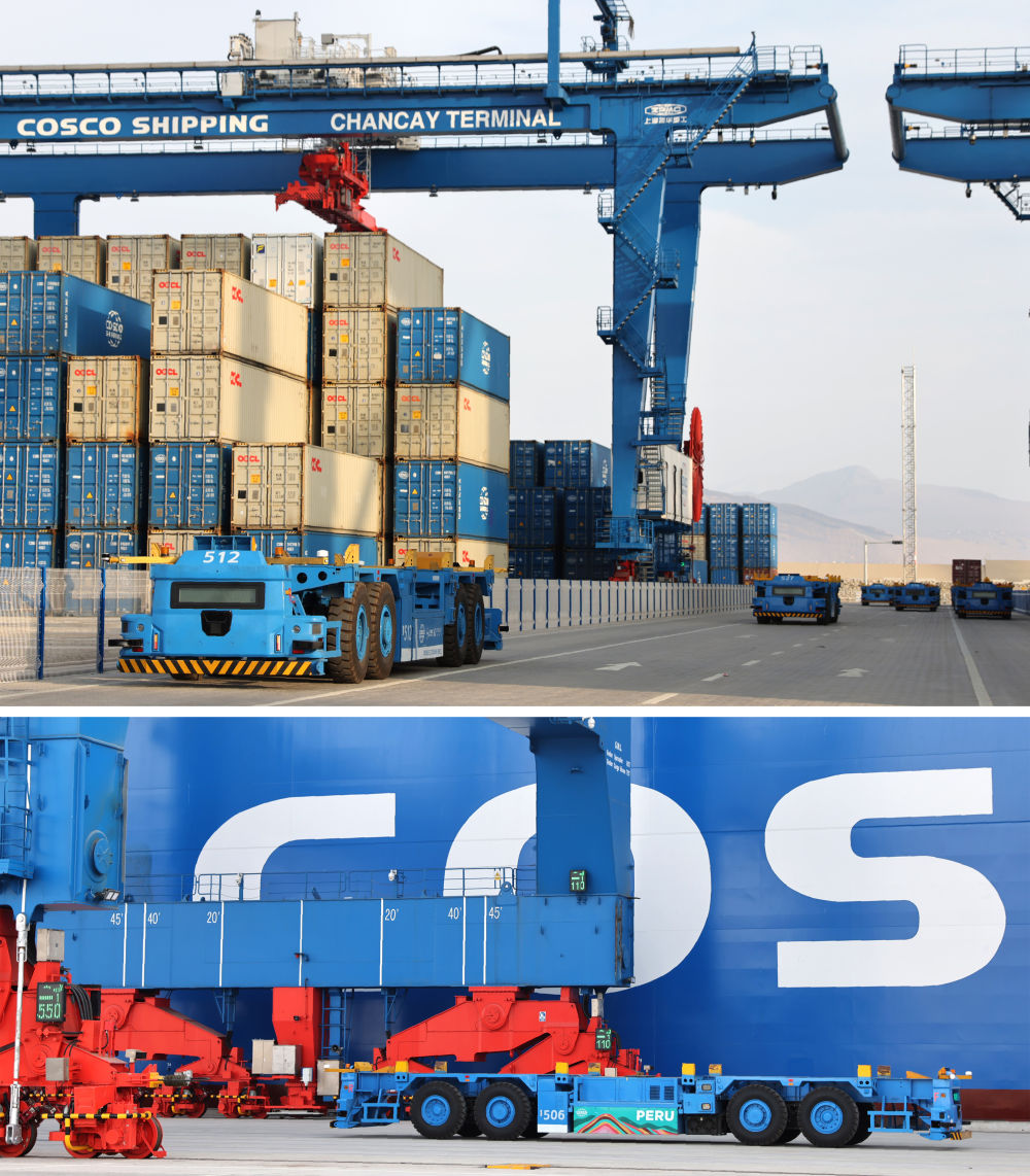 2024年11月14日,自動(dòng)駕駛電動(dòng)集裝箱卡車(chē)穿梭在秘魯錢(qián)凱港碼頭操作區(qū)。