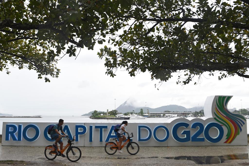 11月16日,在巴西里約熱內(nèi)盧,人們騎車(chē)經(jīng)過(guò)二十國(guó)集團(tuán)領(lǐng)導(dǎo)人峰會(huì)舉辦地附近的峰會(huì)標(biāo)識(shí)。新華社發(fā)(盧西奧·塔沃拉攝)