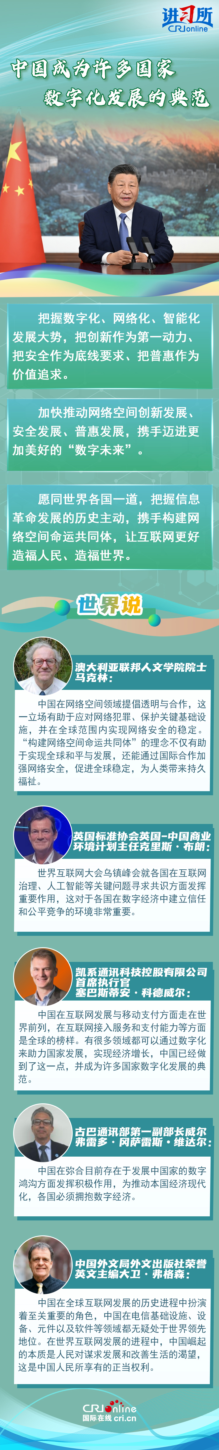 今年是習近平主席提出建設(shè)網(wǎng)絡(luò)強國戰(zhàn)略10周年,也是中國全功能接入國際互聯(lián)網(wǎng)的30周年?;厥住熬W(wǎng)”事,在習近平主席的引領(lǐng)下,中國不斷加強數(shù)字經(jīng)濟、人工智能領(lǐng)域發(fā)展,深化網(wǎng)絡(luò)空間國際交流合作,構(gòu)建網(wǎng)絡(luò)空間命運共同體理念主張不斷深入人心。