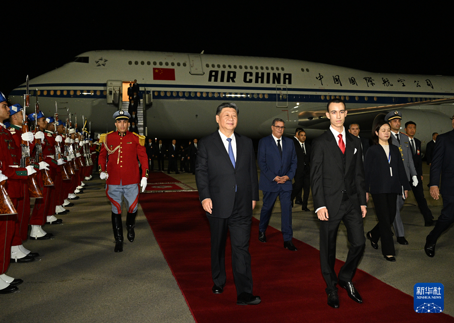 受摩洛哥國王穆罕默德六世指派,摩洛哥王儲(chǔ)哈桑、首相阿赫努什專程赴機(jī)場迎接習(xí)近平,并在機(jī)場舉行歡迎儀式。