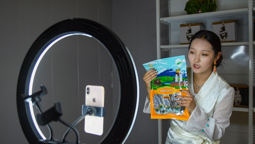 9月24日,果洛藏貢麻村村民多杰吉在進行網(wǎng)絡帶貨直播。(潘彬彬 攝)