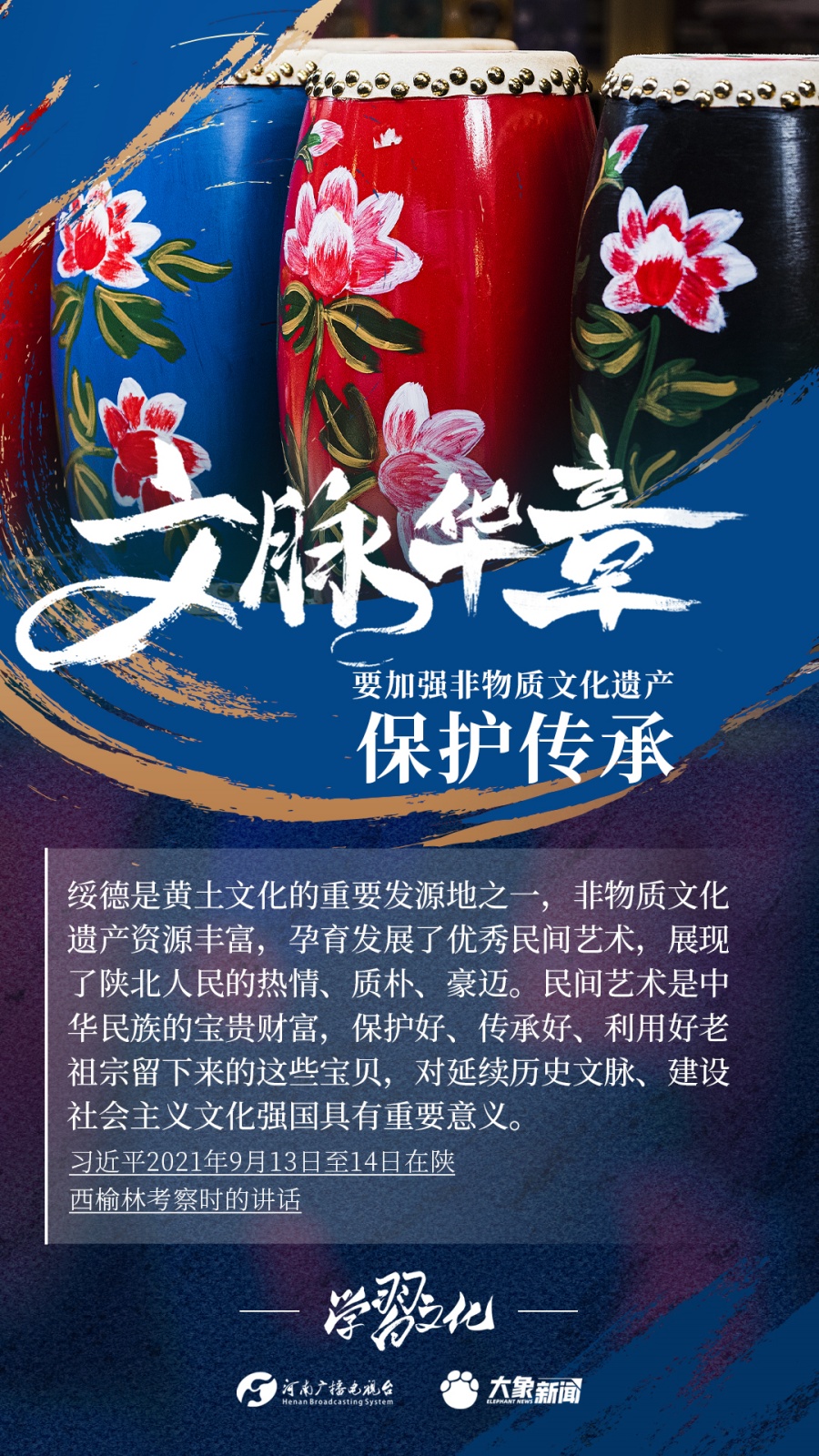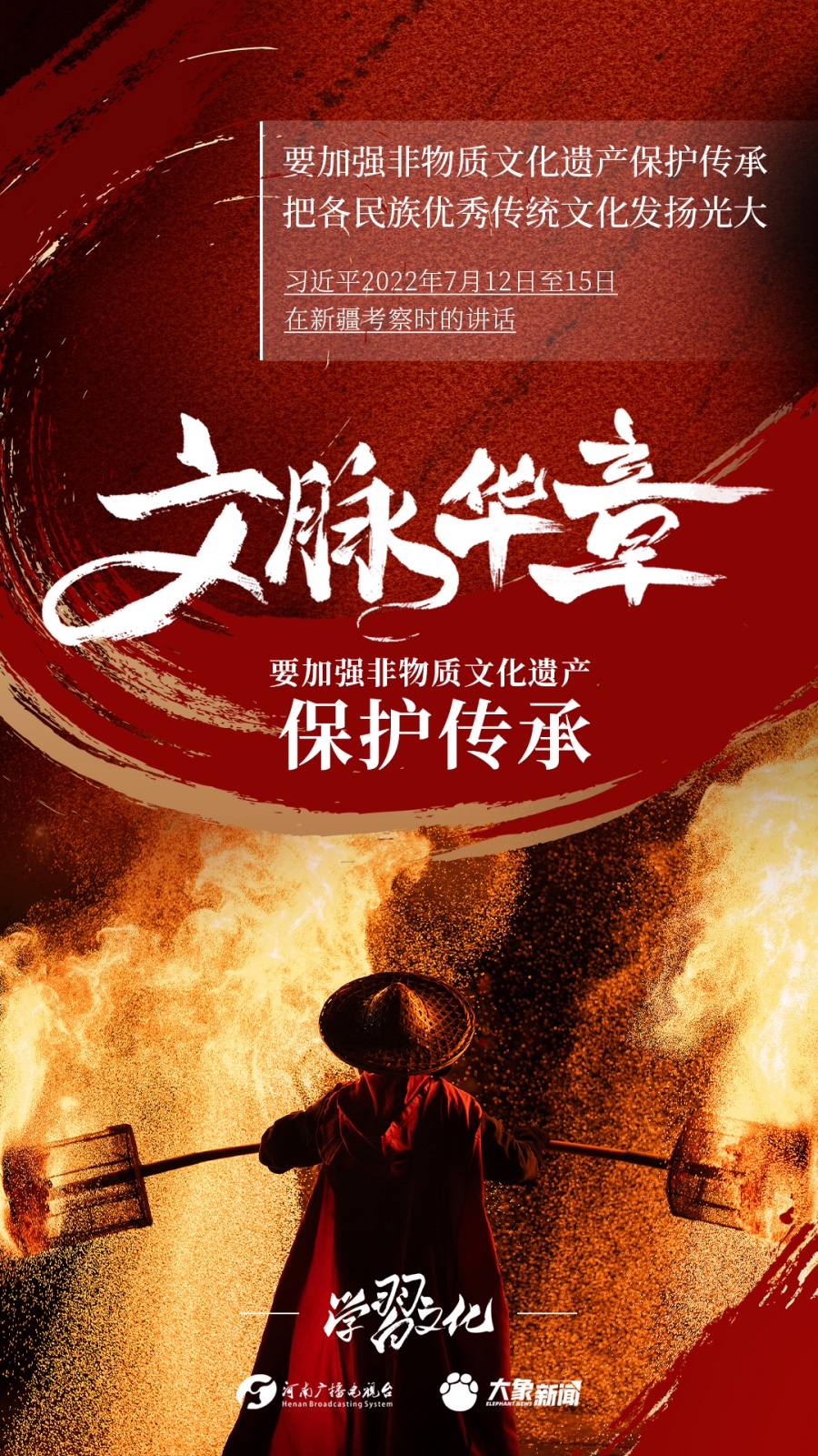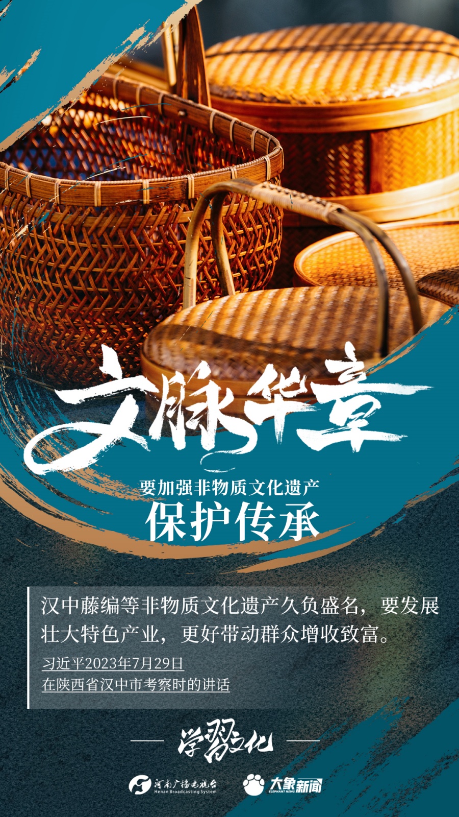 非物質(zhì)文化遺產(chǎn)是中華優(yōu)秀傳統(tǒng)文化的重要組成部分,是中華文明綿延傳承的生動(dòng)見證,是我國(guó)各族人民寶貴的精神財(cái)富。習(xí)近平總書記十分關(guān)心非物質(zhì)文化遺產(chǎn)的保護(hù)傳承,多次強(qiáng)調(diào)“要扎實(shí)做好非物質(zhì)文化遺產(chǎn)的系統(tǒng)性保護(hù)”“培養(yǎng)好傳承人”等。大象新聞為您梳理,邀您一起學(xué)習(xí)、領(lǐng)悟、踐行。