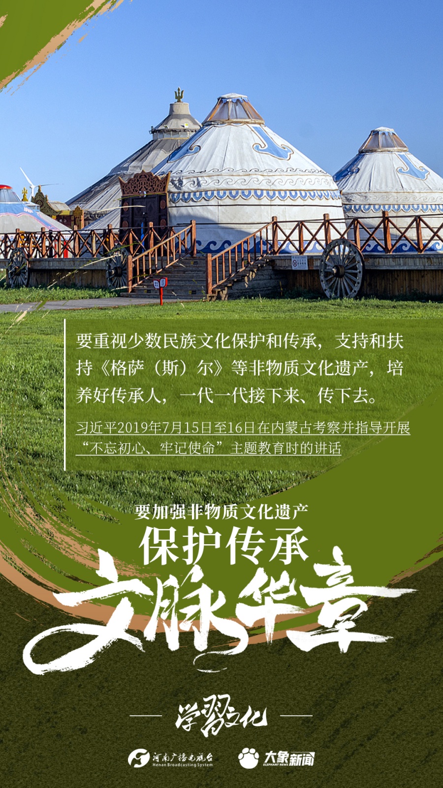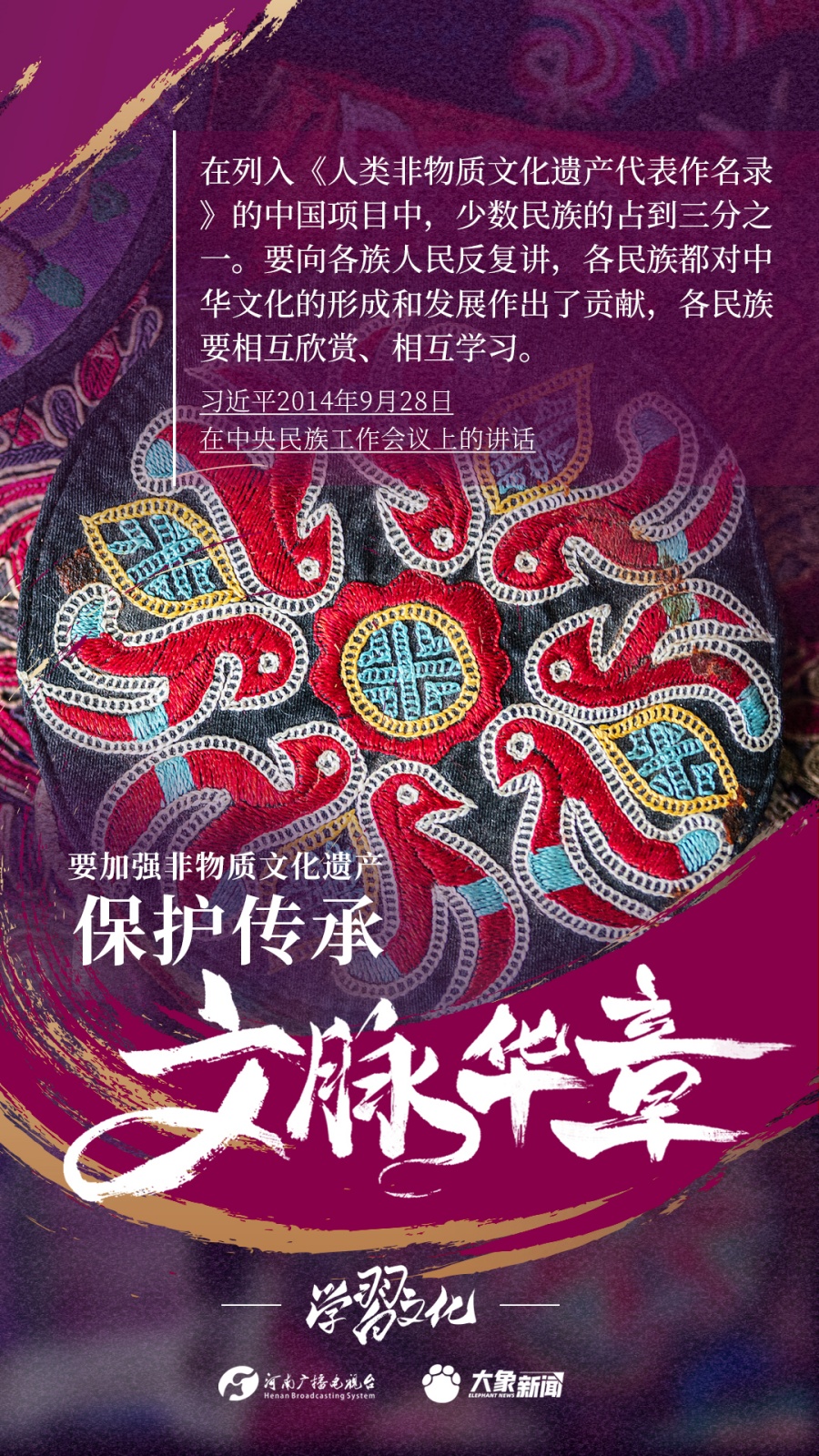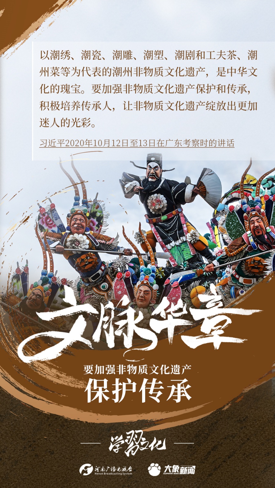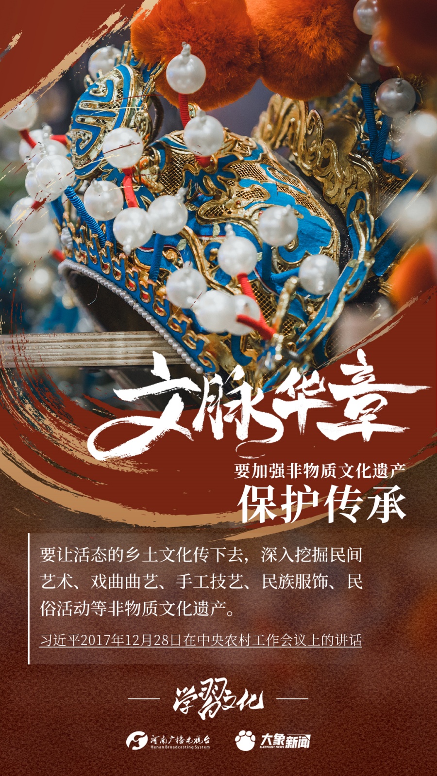 非物質(zhì)文化遺產(chǎn)是中華優(yōu)秀傳統(tǒng)文化的重要組成部分,是中華文明綿延傳承的生動(dòng)見證,是我國(guó)各族人民寶貴的精神財(cái)富。習(xí)近平總書記十分關(guān)心非物質(zhì)文化遺產(chǎn)的保護(hù)傳承,多次強(qiáng)調(diào)“要扎實(shí)做好非物質(zhì)文化遺產(chǎn)的系統(tǒng)性保護(hù)”“培養(yǎng)好傳承人”等。大象新聞為您梳理,邀您一起學(xué)習(xí)、領(lǐng)悟、踐行。