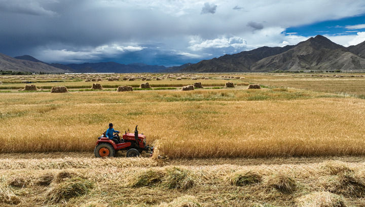 2024年9月10日在西藏日喀則市白朗縣巴扎鄉(xiāng)拍攝的秋收場景(無人機(jī)照片)。新華社記者 晉美多吉 攝