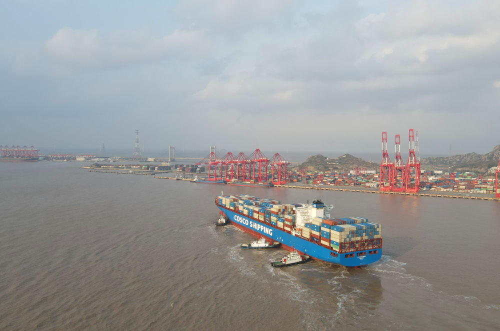 “新上海”輪抵達(dá)洋山港,這是自秘魯錢凱港開港后首個“錢凱—上?!闭胶酱危?024年12月18日攝,無人機照片)。新華社記者 方喆 攝