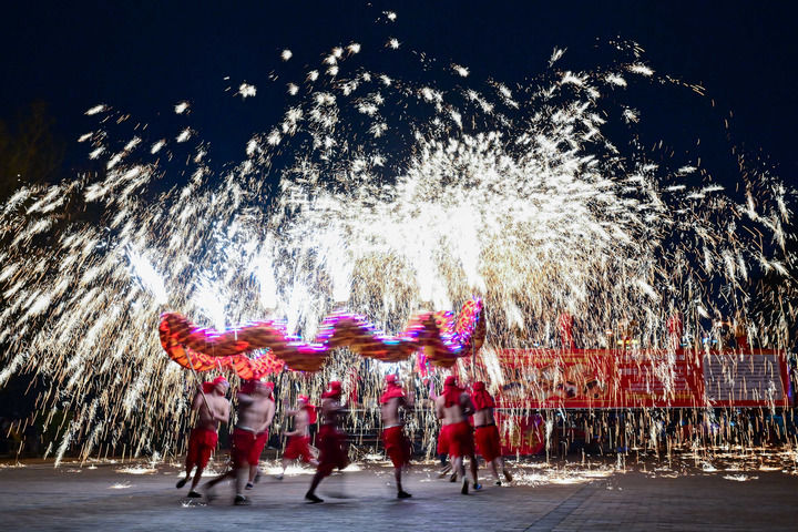 民間藝人在河南省洛陽市2024隋唐河洛文化廟會上表演打鐵花(2024年2月14日攝)。新華社發(fā)(李衛(wèi)超攝)