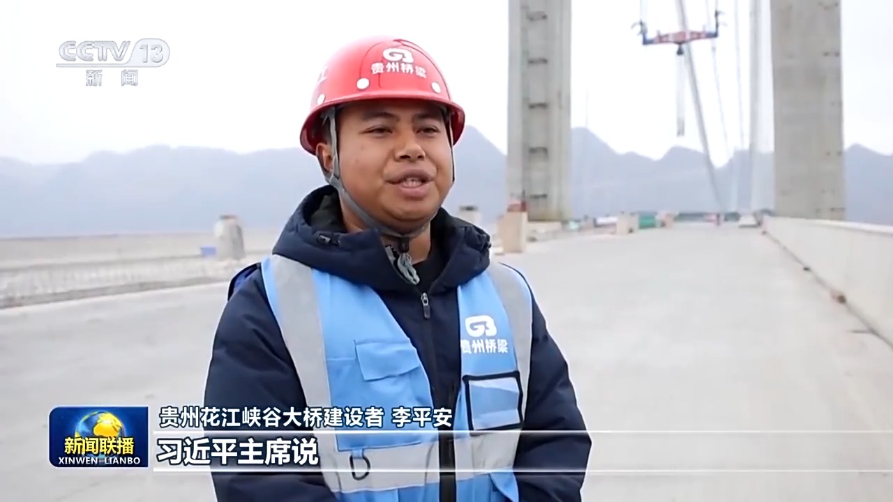 貴州花江峽谷大橋建設(shè)者 李平安:習(xí)近平主席說,新征程上,每一個(gè)人都是主角。我覺得非常自豪,心里也感到非常溫暖。我們正在建設(shè)的花江峽谷大橋春節(jié)前后即將合龍,將是世界第一高橋。我們一定會(huì)認(rèn)真細(xì)致,高質(zhì)量地完成工程任務(wù),把中國式現(xiàn)代化的美好愿景,書寫在祖國的山川河流之間。