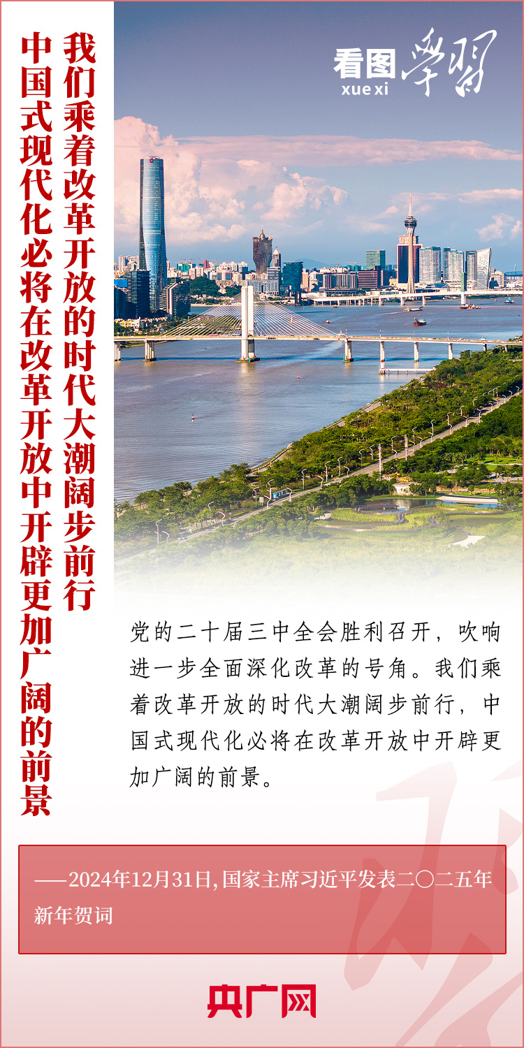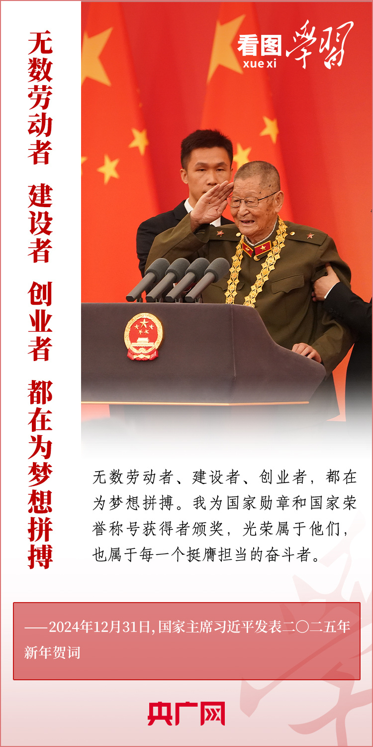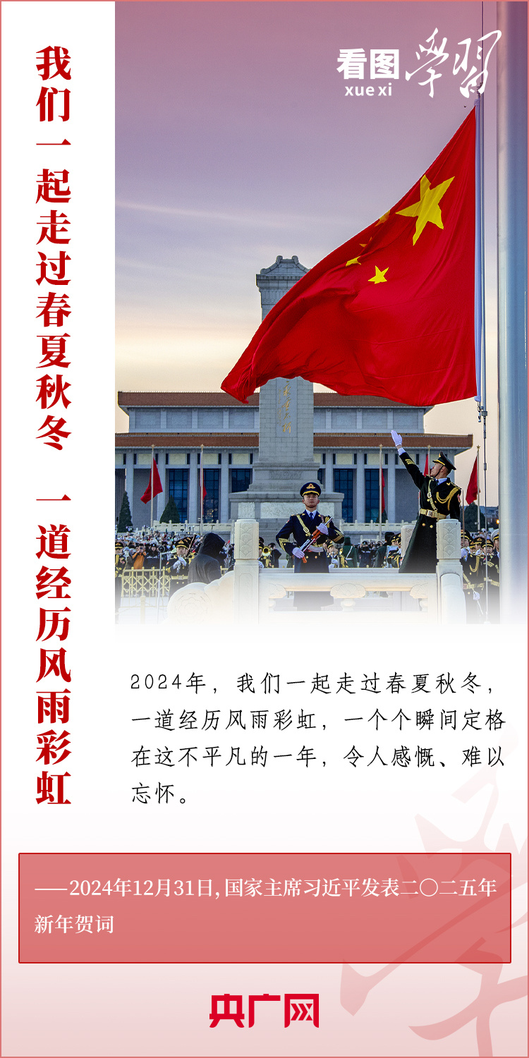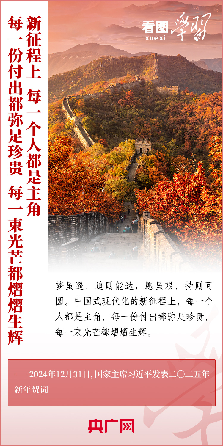 “夢(mèng)雖遙,追則能達(dá);愿雖艱,持則可圓。”新年前夕,習(xí)近平主席發(fā)表二〇二五年新年賀詞。在溫暖有力的講述中,習(xí)主席深情回望過去一年中國不平凡的奮斗歷程、精彩瞬間,感慨大家一道經(jīng)歷的風(fēng)雨彩虹、難忘時(shí)刻,贊美無數(shù)為夢(mèng)想拼搏的勞動(dòng)者、建設(shè)者、創(chuàng)業(yè)者。習(xí)主席說,中國式現(xiàn)代化的新征程上,每一個(gè)人都是主角,每一份付出都彌足珍貴,每一束光芒都熠熠生輝。讓我們充滿信心,在新的一年接續(xù)奮斗!