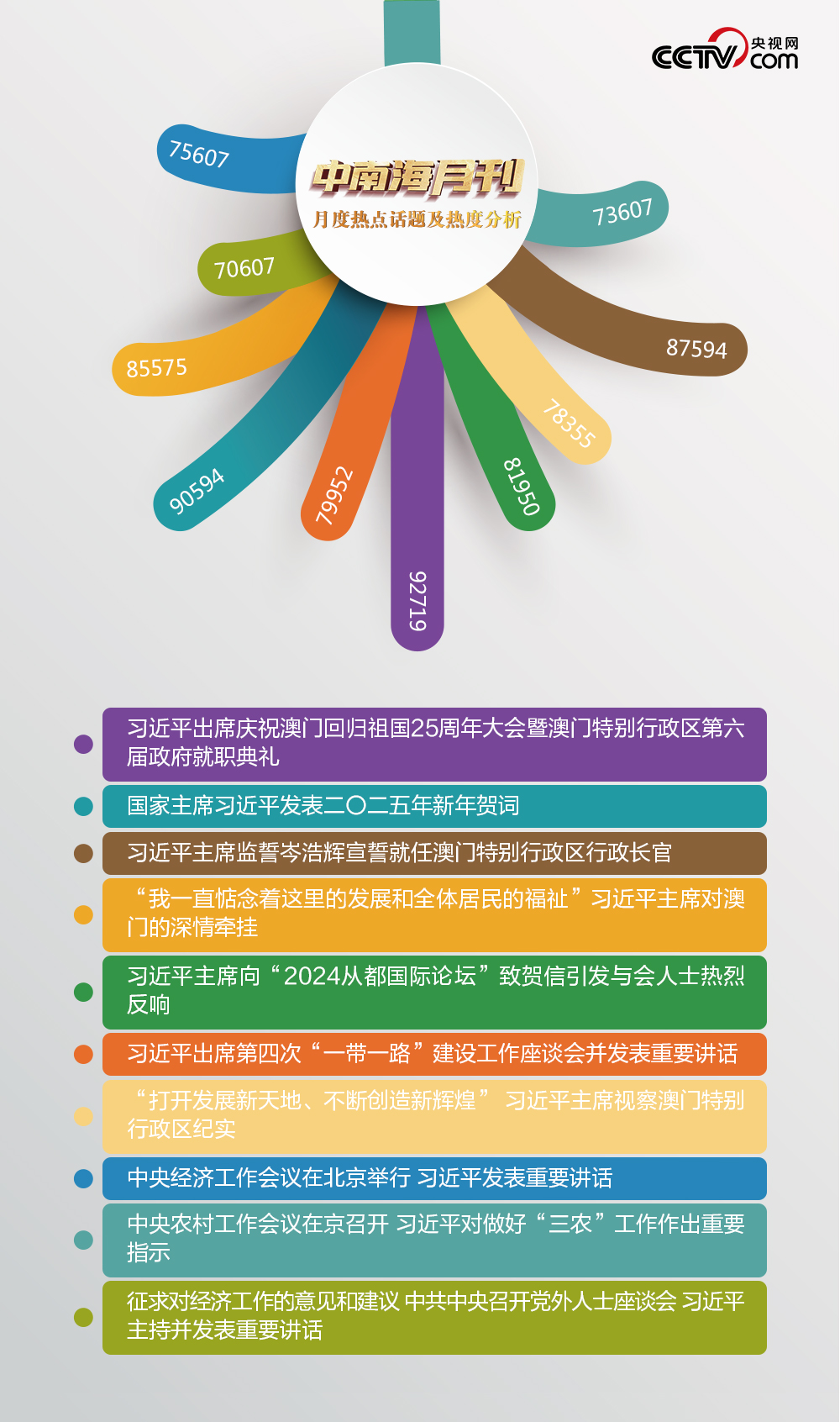南海風(fēng)起,百舸爭(zhēng)流。盛世蓮花,灼灼生華。央視網(wǎng)“智聞”系統(tǒng)提取分析2024年12月全網(wǎng)時(shí)政新聞熱點(diǎn),習(xí)近平主席澳門(mén)之行吸引全網(wǎng)關(guān)注。