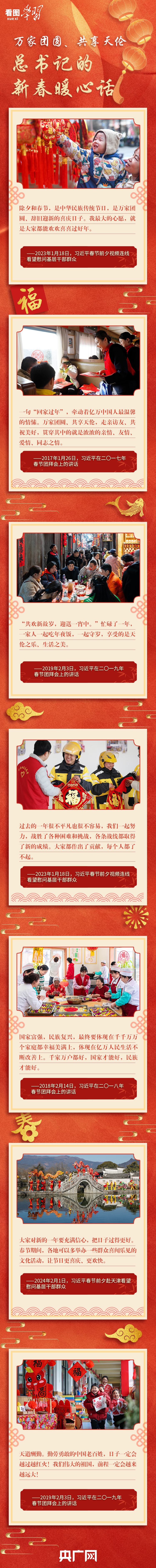 “共歡新故歲,迎送一宵中。”作為中華民族的傳統(tǒng)節(jié)日,除夕和春節(jié)是萬家團圓、辭舊迎新最重要的日子。每年春節(jié)前夕,習近平總書記都要看望慰問各地基層干部群眾,向全國各族人民送上新春祝福。