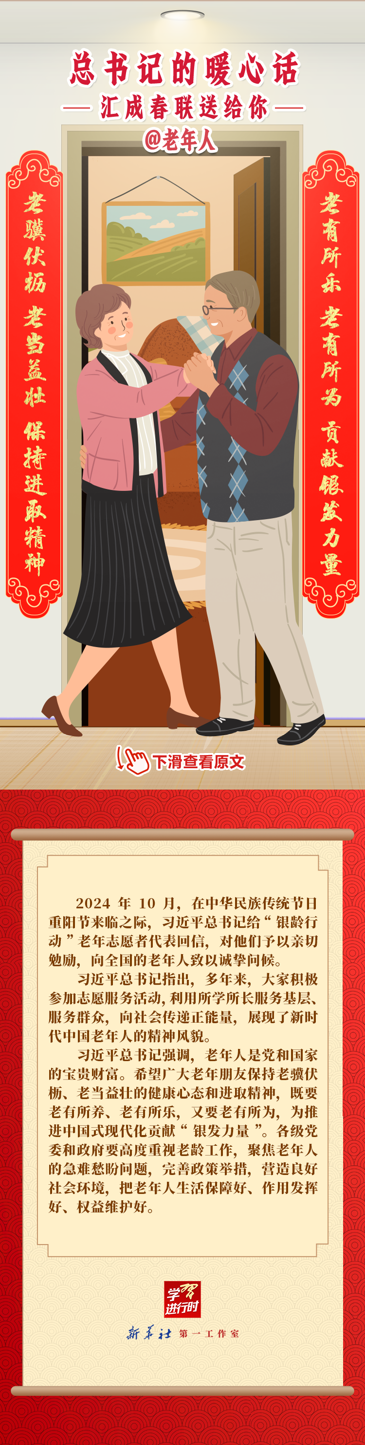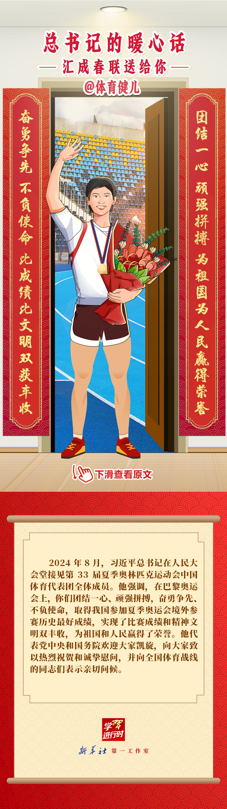 【學(xué)習(xí)進(jìn)行時(shí)】過(guò)春節(jié),貼春聯(lián),寄托人們對(duì)新年的美好愿望。過(guò)去一年,習(xí)近平總書(shū)記在不同場(chǎng)合點(diǎn)贊各行各業(yè)奮斗者,說(shuō)了許多暖心話。新春之際,我們匯編成聯(lián),向新征程上的每一位“主角”致敬,送上新春的祝福。