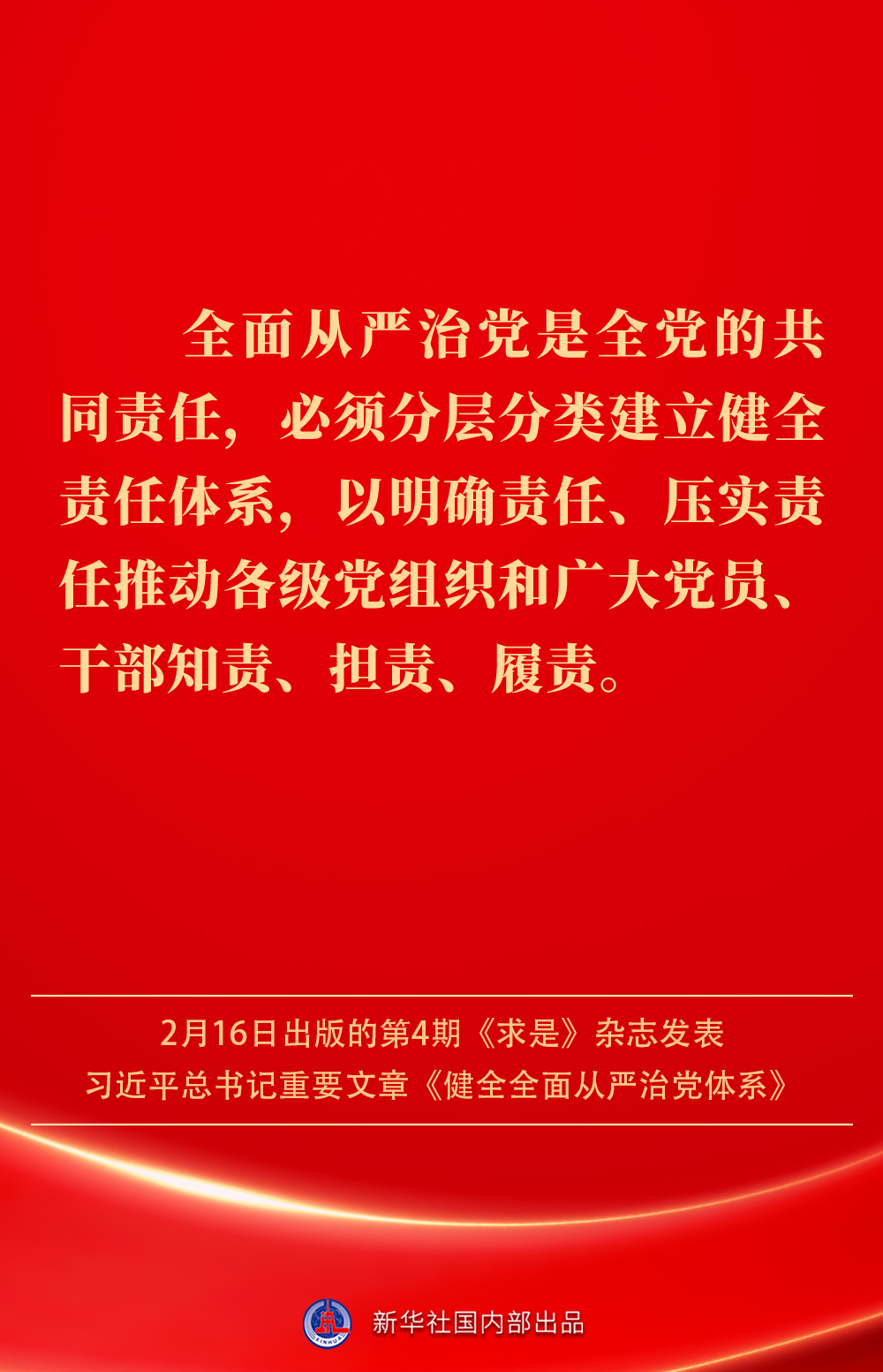 2月16日出版的第4期《求是》雜志發(fā)表習(xí)近平總書記重要文章《健全全面從嚴(yán)治黨體系》。如何進(jìn)一步健全要素齊全、功能完備、科學(xué)規(guī)范、運(yùn)行高效的全面從嚴(yán)治黨體系?習(xí)近平總書記闡明要旨——