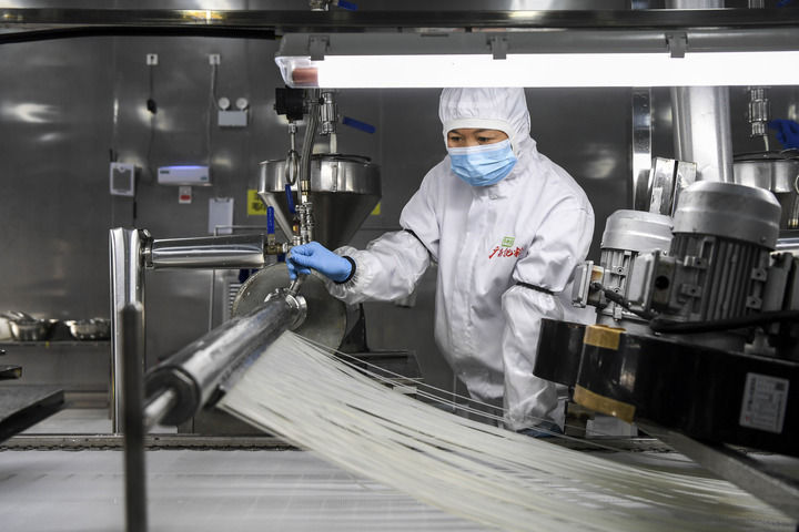 在廣西柳州市一家螺螄粉生產(chǎn)企業(yè),工作人員在查看米粉的生產(chǎn)情況(2024年12月13日攝)。新華社記者 曹祎銘 攝